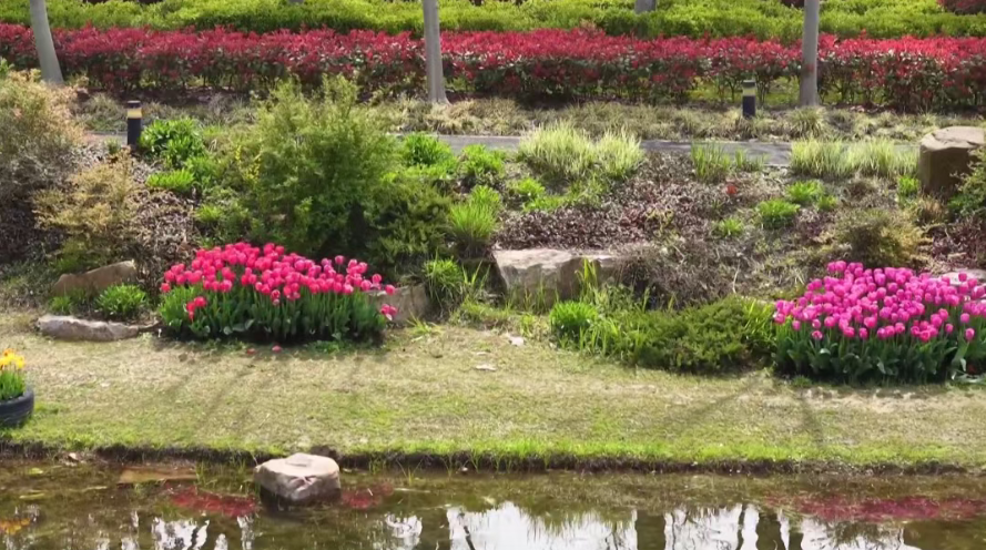 公园里的色彩远不止粉白。一条由火红红花檵木组成的小路,以其幽静而热烈的气质自成风景。碧绿的草坪四周,粉红、金黄、蓝紫等各色春花点缀其间,宛如一幅精致的油画。而在公园一号门附近,中华木绣球也正值“青春”,青绿色的花瓣正默默舒展,酝酿着下一场盛放。公园对面的湖边,成片的郁金香色彩斑斓,随风摇曳,为这幅春日图景添上了浓墨重彩的一笔。