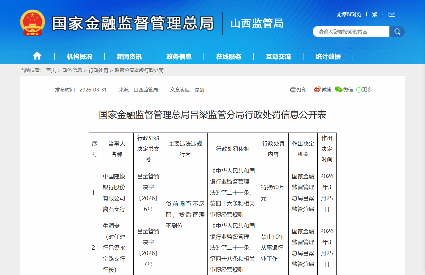 央广网太原4月1日消息(记者张洁)3月31日,据国家金融监督管理总局吕梁监管分局行政处罚信息公开表显示,中国建设银行股份有限公司离石支行因贷前调查不尽职、贷后管理不到位,被罚款60万元。中国建设银行股份有限公司吕梁分行因贷中审查审批不审慎,被罚款30万元。
