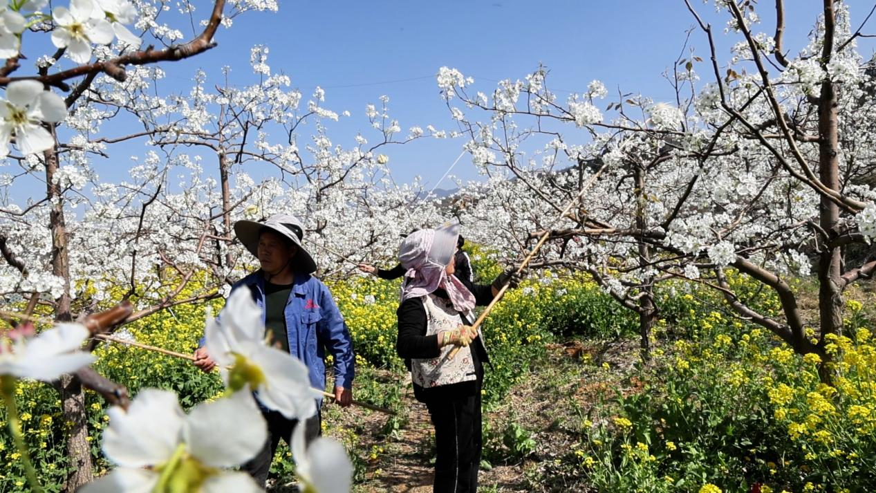 果农们手持授粉长杆,穿梭于梨树枝丫间(垣曲融媒供图)