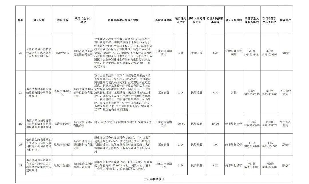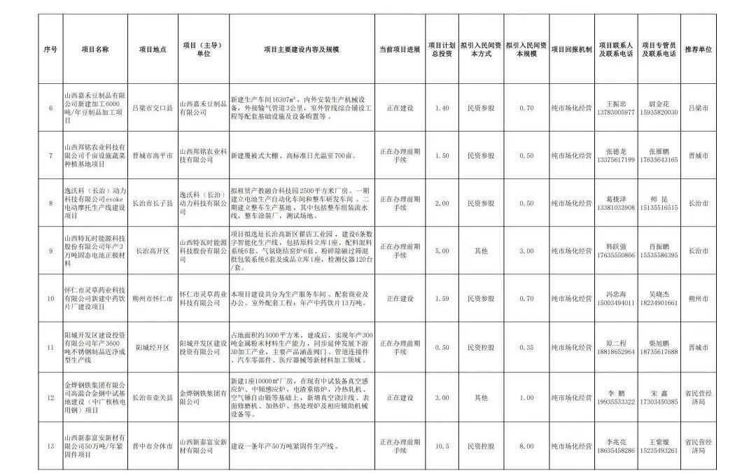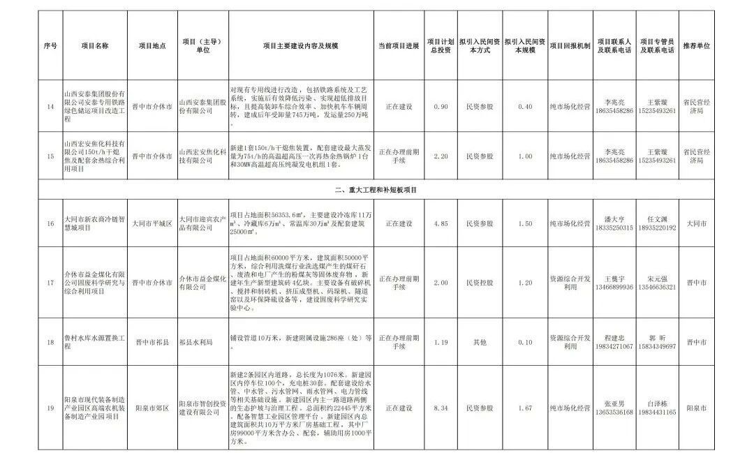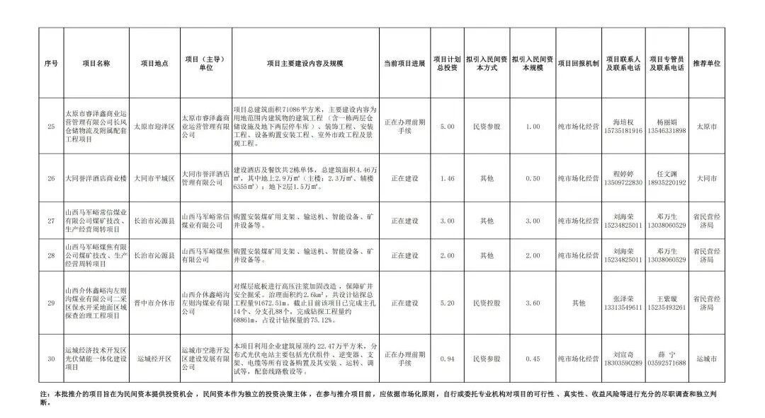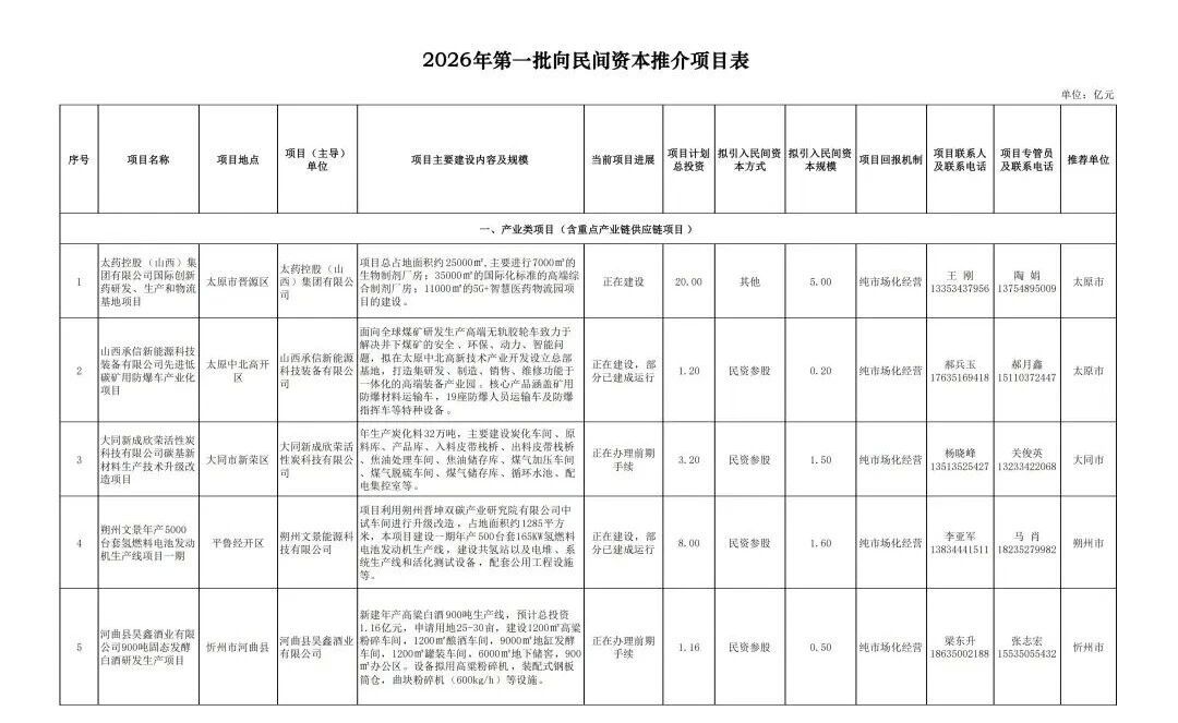 央广网太原3月28日消息(记者尹琳岑)日前,据山西省发改委网站消息,为全面落实山西省委、省政府关于持续开展重大项目建设年工作安排,切实激发民间投资活力。山西省发展改革委、山西省民营经济局组织各市重点围绕山西民营百强企业、大型民营企业和民营科技领军企业等,遴选了2026年第一批向民间资本推介项目,现发布具体项目名单。