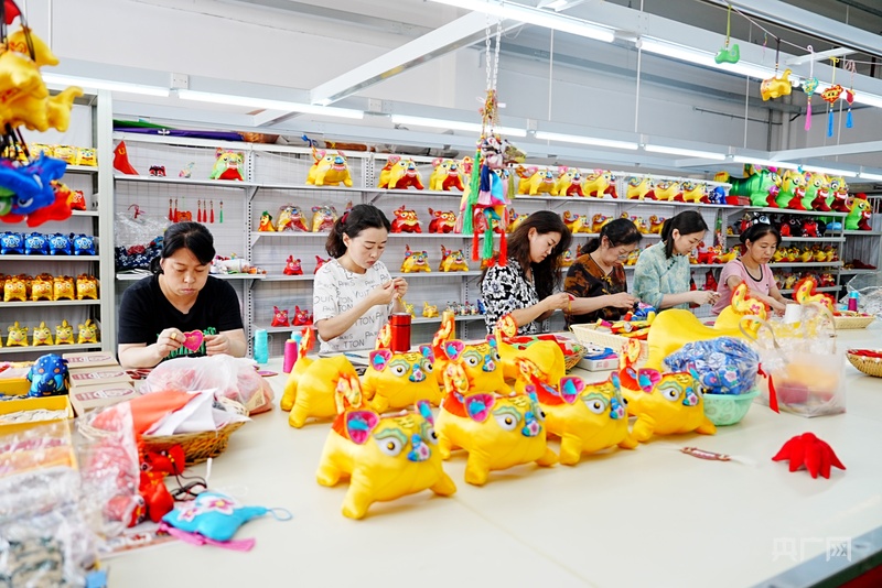 李爱萍带领女工们制作“将军虎”(央广网记者 张晋鹏 摄)