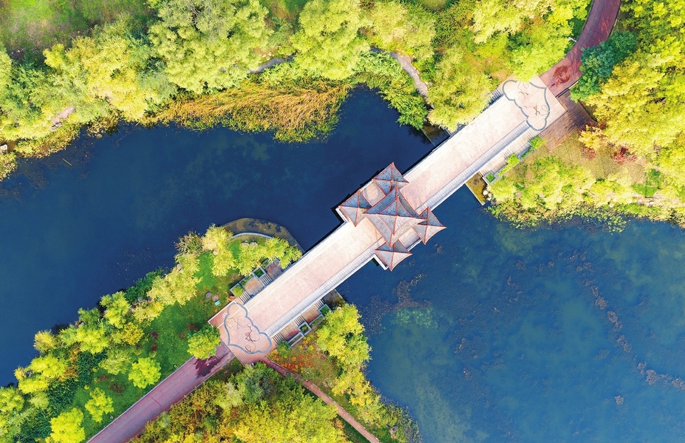 10月25日拍摄的临汾市汾河文化生态景区。景区内波光粼粼,水草摇曳,叠翠流金。近年来,当地通过建设城市公园,绿化美化城市空间,实现开门见绿、推窗见景。(记者 李现俊)