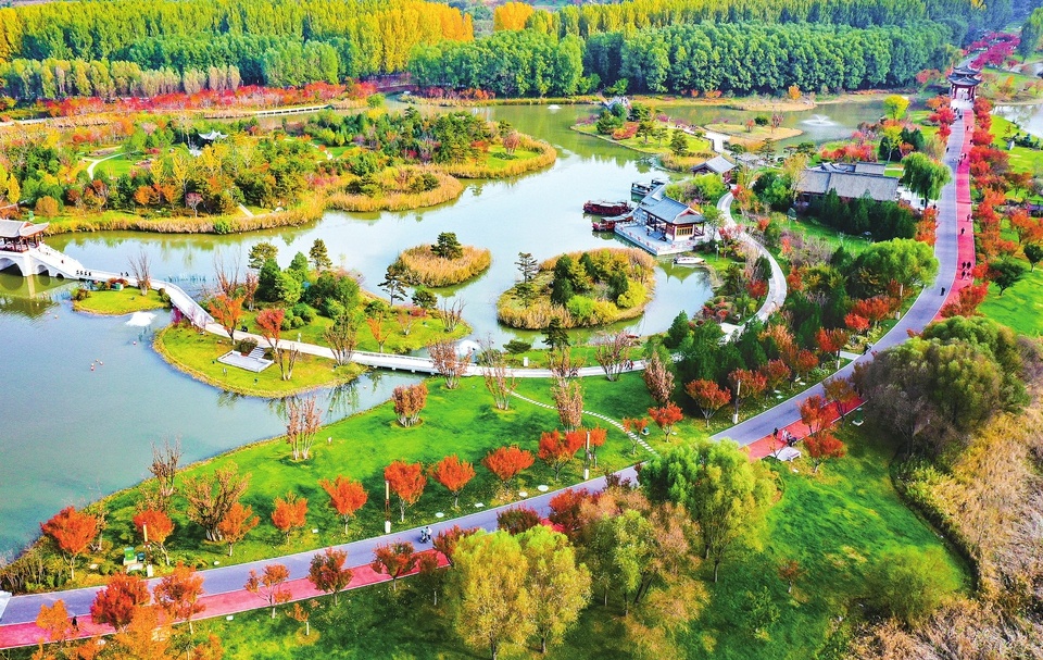 10月26日,长治漳泽湖国家城市湿地公园,五彩斑斓的秋景如诗如画,吸引市民和游客前来观赏打卡,享受秋日美好时光。(徐翔)