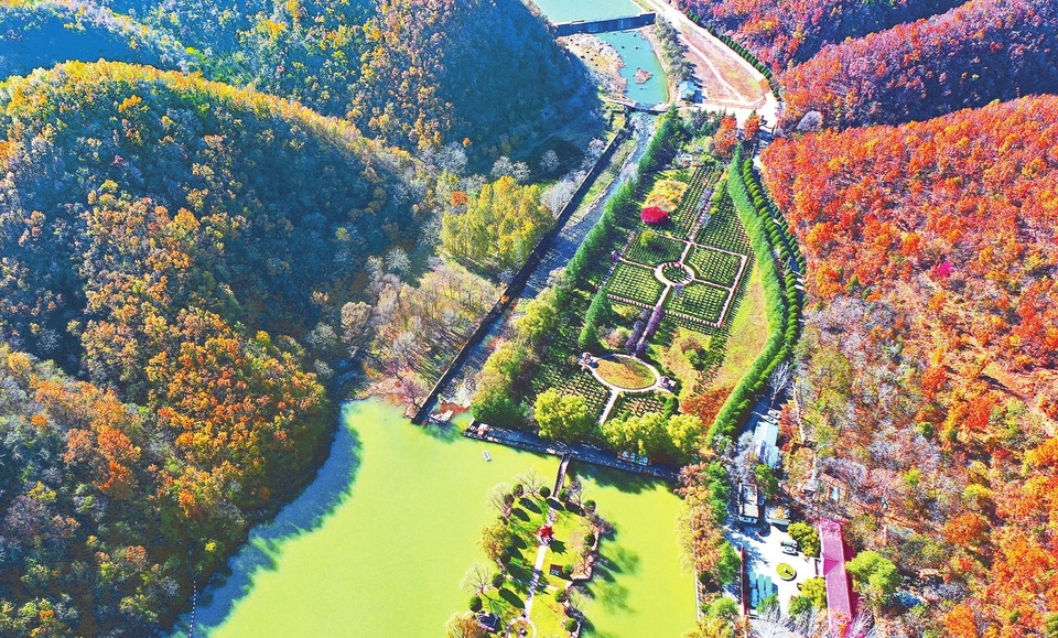 时至深秋,垣曲县望仙大峡谷内,碧绿的湖水与满山红叶相映衬。