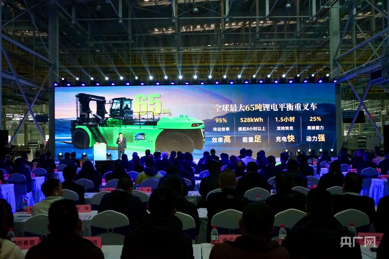 在当天的发布现场,最抢眼的C位当属一辆65吨级叉车,它是目前全球最大的锂电平衡重叉车。“这辆叉车最大能扛65吨,相当于一次性举起几十辆家用小汽车!强劲的动力来自528kWh锂电池组,而且双枪快充1.5小时就能满血复活。由于采用锂电池,它的碳排放量为零。”太重集团技术专办赵鹏新告诉记者。这辆“巨无霸”能在港口码头、钢铁企业、大型基建工程中,提供强大的起重能力和精准的微动控制。“它代表了重载搬运电气化最高水平。”赵鹏新说。