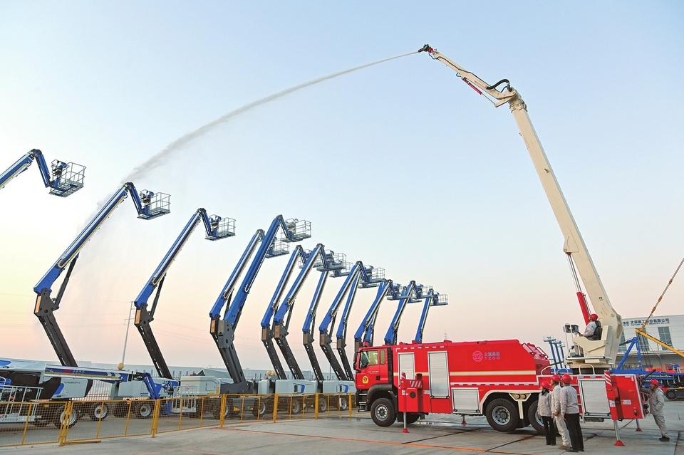 日前,山西太重工程起重机公司技术团队开展消防车喷水试验。目前,太重打造的91米登高平台消防车“高空巨人”已完成喷水测试,还打造了举高喷射消防车、消防机器人等全品类消防救援装备。(记者 申晋光)