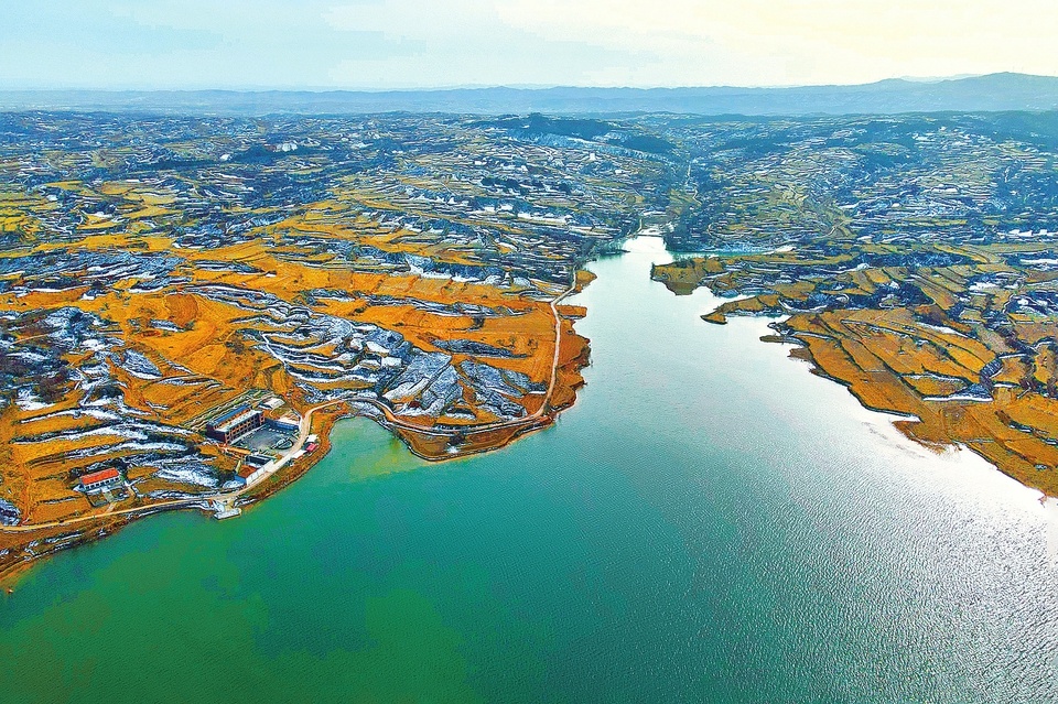 日前,俯瞰山西省长治市屯留区屯绛水库,水面波光粼粼,与蓝天、黄土相映,绘就冬日生态画卷。近年来,当地持续加强生态保护修复,推进“调水、控污、清淤、畅通、扩绿、增长”,为群众营造了舒适宜人的生态家园。(杨晨玉 摄)