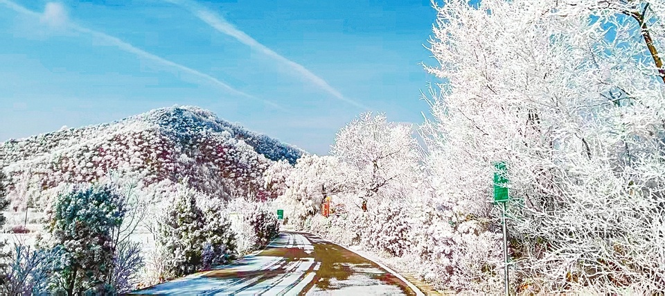 1月20日,山西省晋中市左权县羊角乡境内,太行一号旅游公路两侧现雾凇冰挂的绝佳美景,山林间玉树琼枝、冰清玉洁,美不胜收,勾勒出一幅静谧悠然的太行冬日画卷。(邢兰富)