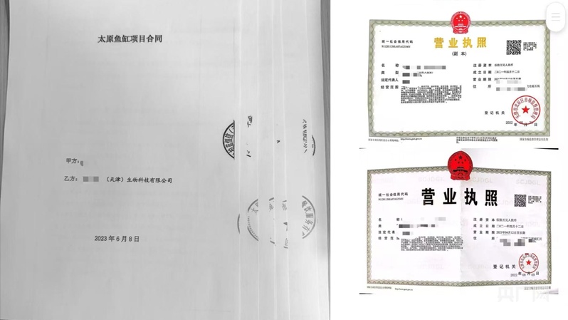 商家提供的鱼类、鱼缸采购合同及销售方营业执照(央广网记者张晋鹏制图)