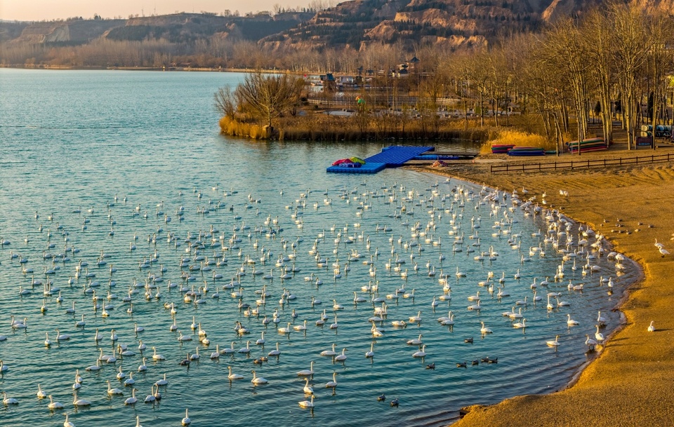 近日,山西省芮城县圣天湖景区,成群的白天鹅沐浴在晨光里,与湖光山色构成诗情画意的美景。近年来,当地不断加大对圣天湖生态环境的保护力度,为白天鹅越冬打造了温馨家园,越冬栖息的白天鹅数量也随之逐年增多。(薛俊摄)