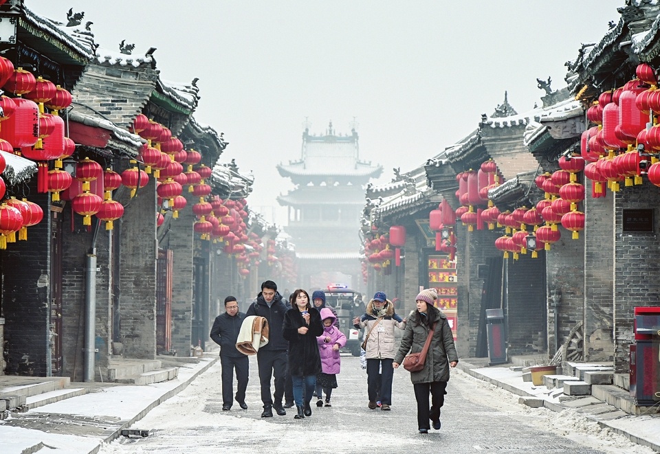 1月30日,山西省平遥县迎来降雪,雪中的平遥古城银装素裹,与大红灯笼相映成趣。游客漫步古城游览观光,赏雪景、品年味,勾勒出一幅瑞雪迎春的美好图景。(梁生仁 摄)