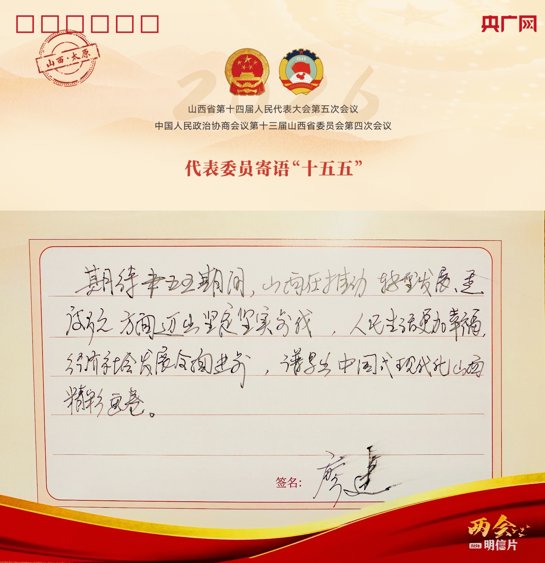 在采访最后,廖建在明信片上写下了对“十五五”的寄语——期待“十五五”期间,山西在推动转型发展、适度多元方面迈出坚实步伐,人民生活更加幸福,经济社会发展全面进步,谱写中国式现代化山西精彩画卷。