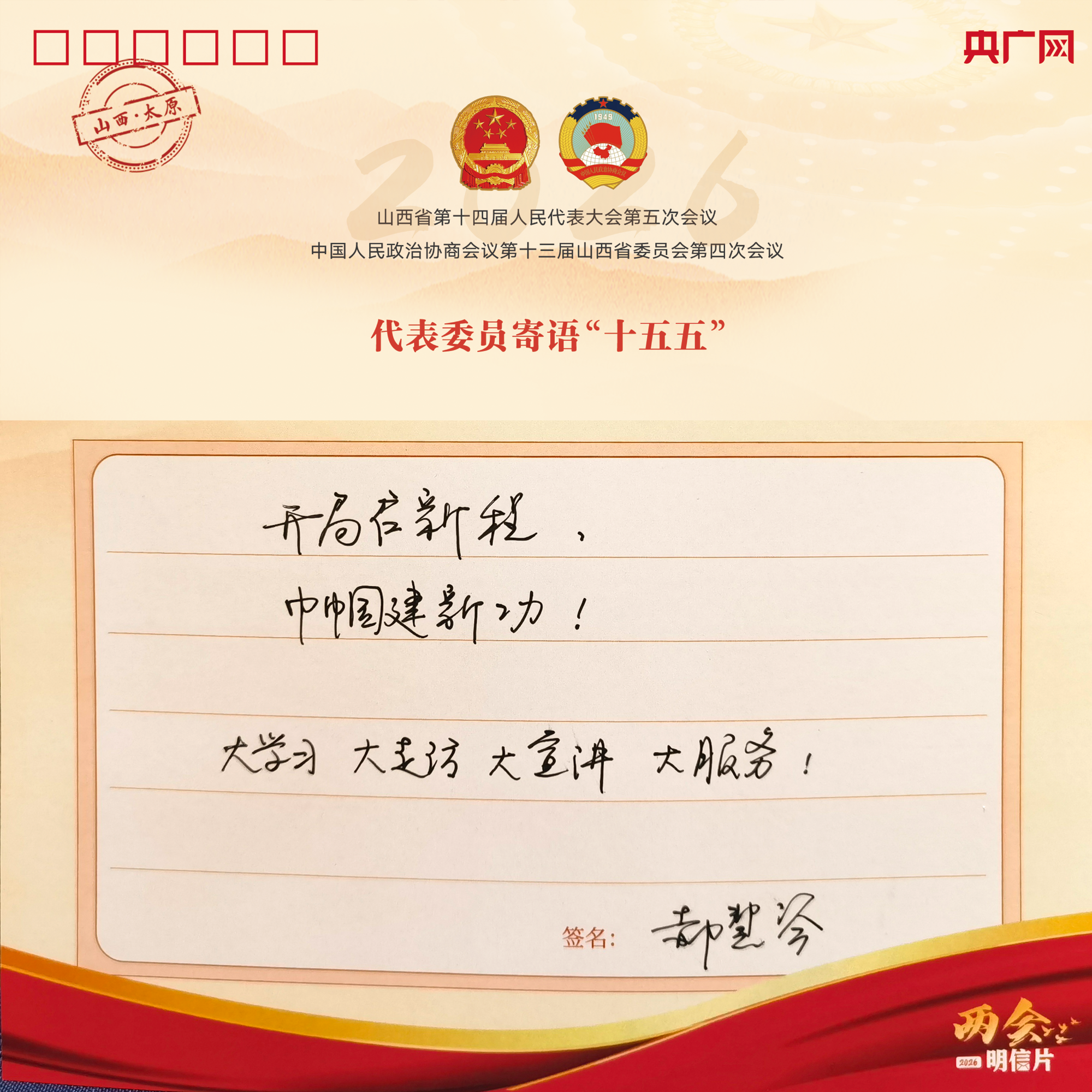 在采访最后,郝慧琴代表在明信片上写下“十五五”寄语——开局启新程,巾帼建新功!大学习、大走访、大宣讲、大服务!
