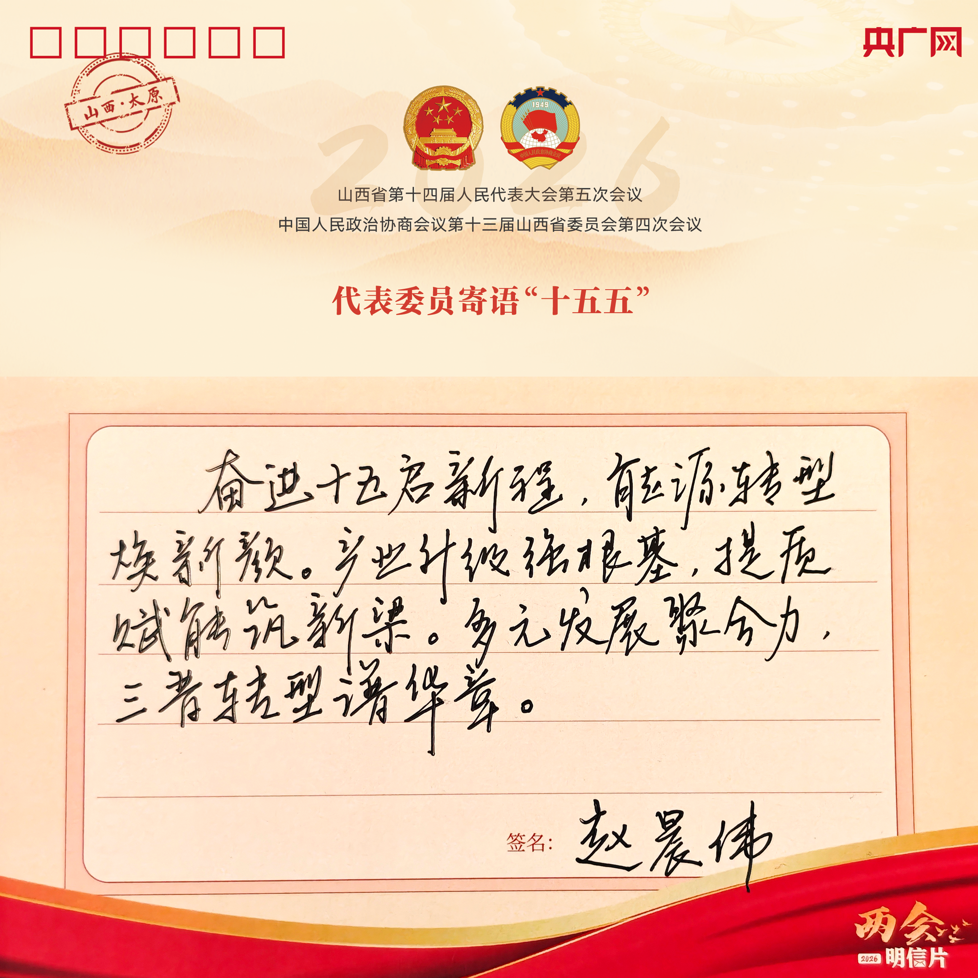 展望“十五五”,赵晨伟代表在明信片上写下寄语 — —奋进十五启新程,能源转型焕新颜。产业升级强根基,提质赋能筑新梁。多元发展聚合力,三晋转型谱华章。