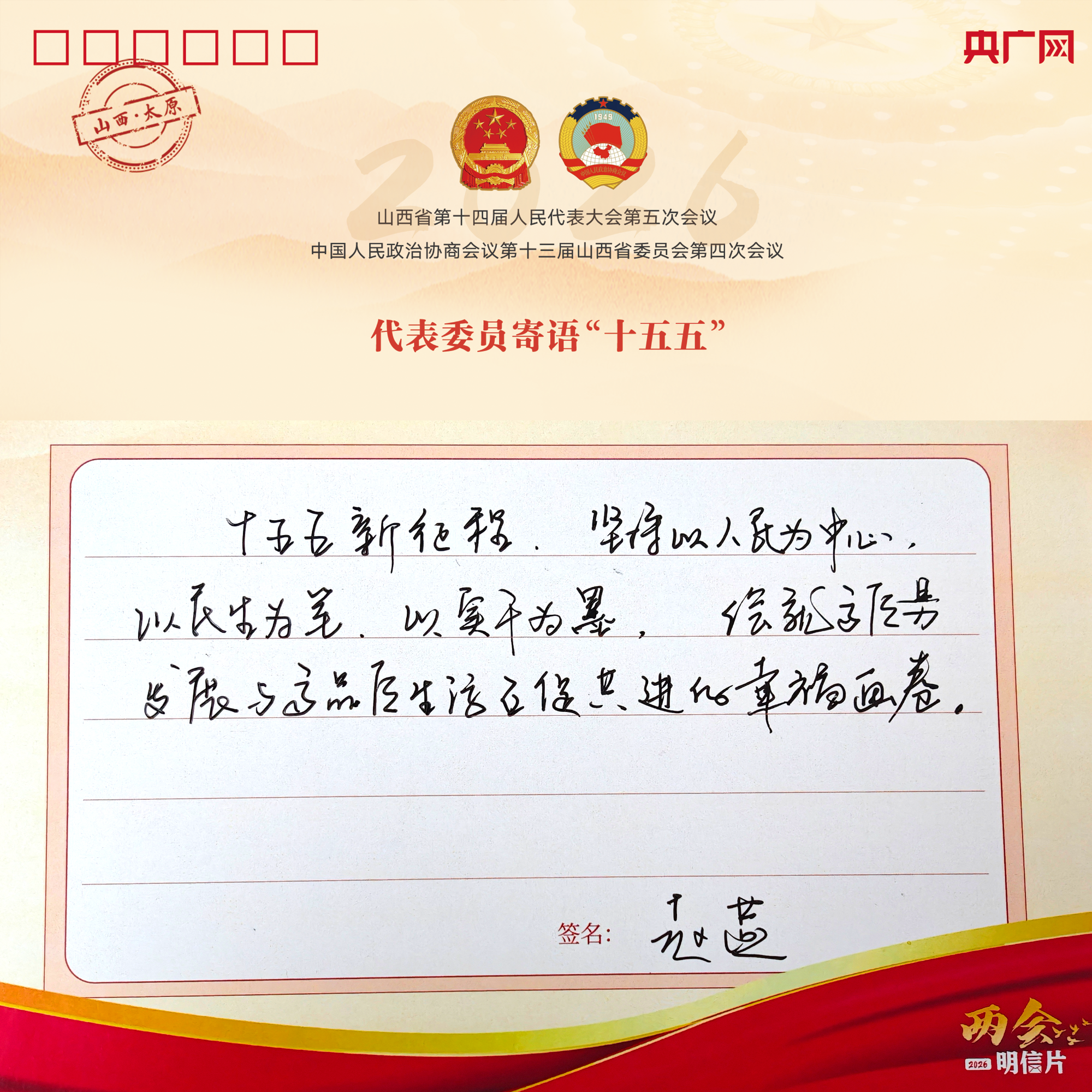 展望“十五五”,赵燕在明信片上寄语未来——“十五五”新征程,坚持以人民为中心,以民生为笔,以实干为墨,绘就高质量发展与高品质生活互促共进的幸福画卷。