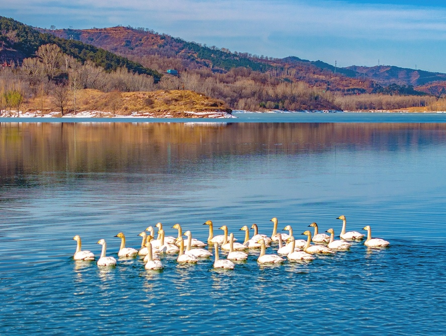 日前,山西省左权县清漳河国家湿地公园石匣库区,一群天鹅在水中悠然游弋,为沉寂山野带来勃勃生机。近年来,左权县持续推进清漳河流域生态综合治理,大力实施湿地保护与修复工程,生态环境显著改善,鸟类数量逐年增多。(张文军 摄)