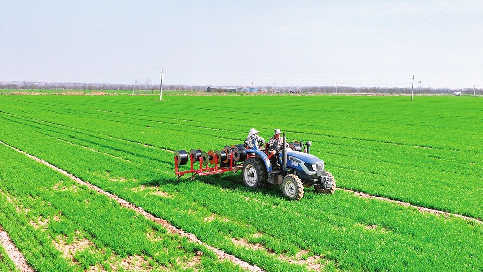 3月20日,永济市黄河滩万亩麦田,农户抢抓农时,有序开展滴灌设施铺设工作,为返青麦苗精准供水。(陈春明 摄)
