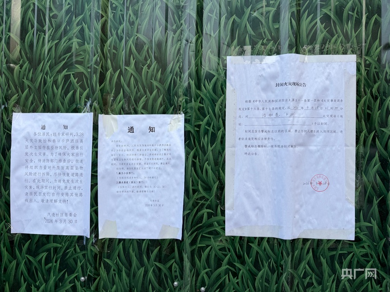 记者在事发现场看到,失火大楼外围已拉起警戒线,只允许相关工作人员进出。警戒区不时有垃圾清运车出入,运送楼内清理出的燃烧残留物。大楼受损的外立面仍有烧灼物时有掉落,社区已在周边张贴风险通知,表示将尽快对松动外立面进行拆除,以恢复通行安全。