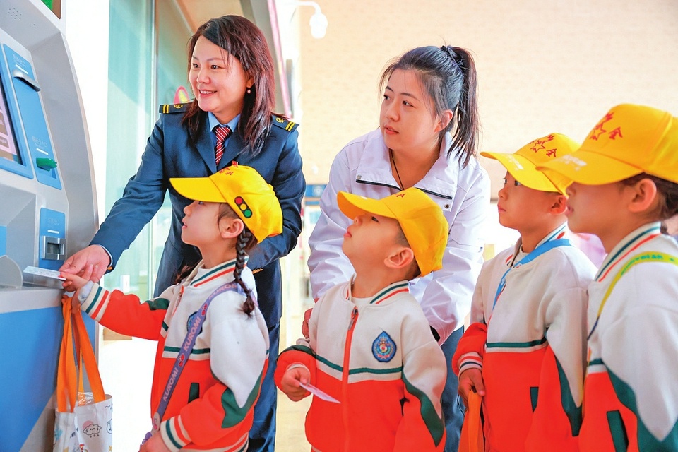 工作人员教小朋友使用自助售票机,体验购票流程。(山西日报通讯员 摄)