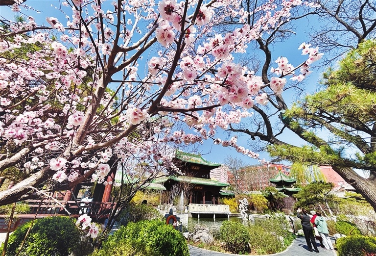 春和景明,花事渐盛,太原市各景区迎来众多游客。图为3月31日,在晋商博物院内,游人赏花踏青。(邓寅明)
