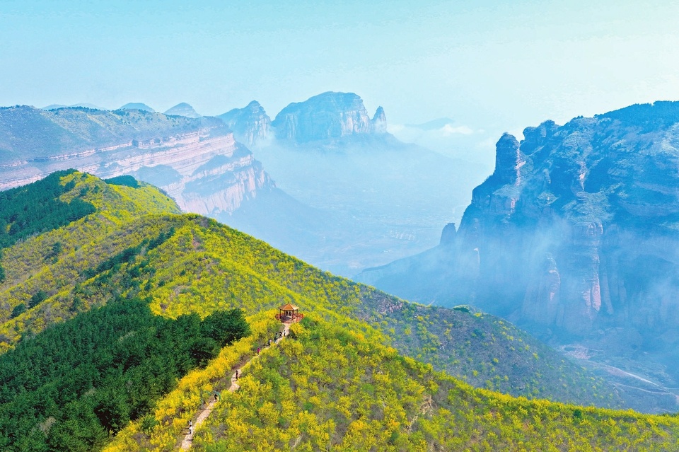 4月9日,黎城县洗耳河景区听松岭春意盎然。漫山连翘花次第绽放,缀满太行山峦,山间石板步道蜿蜒向前,远处的茶壶山云雾缭绕,层峦若隐若现,尽显太行生态美景。(张国平)