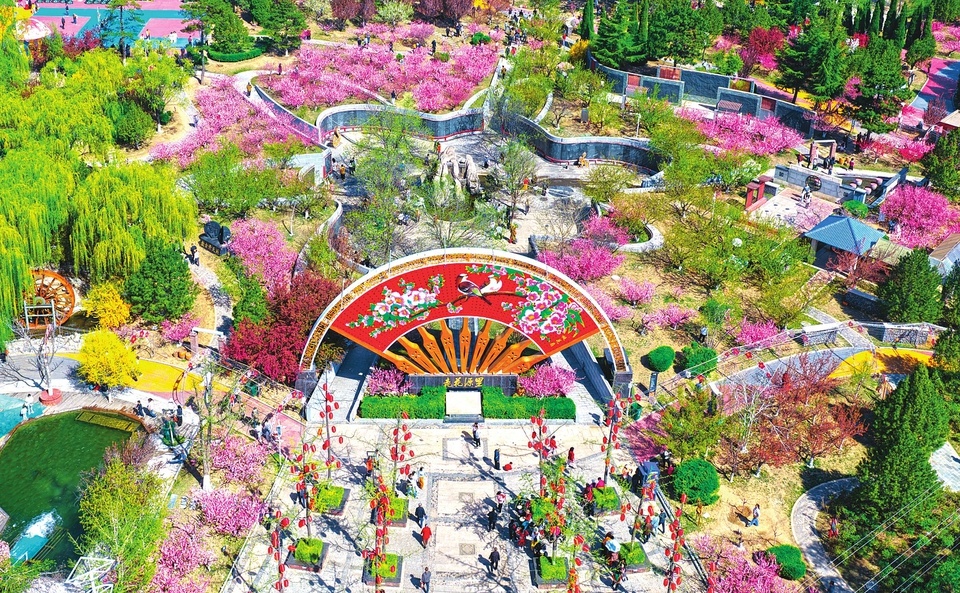 阳泉市桃林沟以花为媒,打造集文化体验、休闲娱乐、美食消费于一体的文旅地标,吸引人们来此赏花游玩。(赵玉虎 摄)