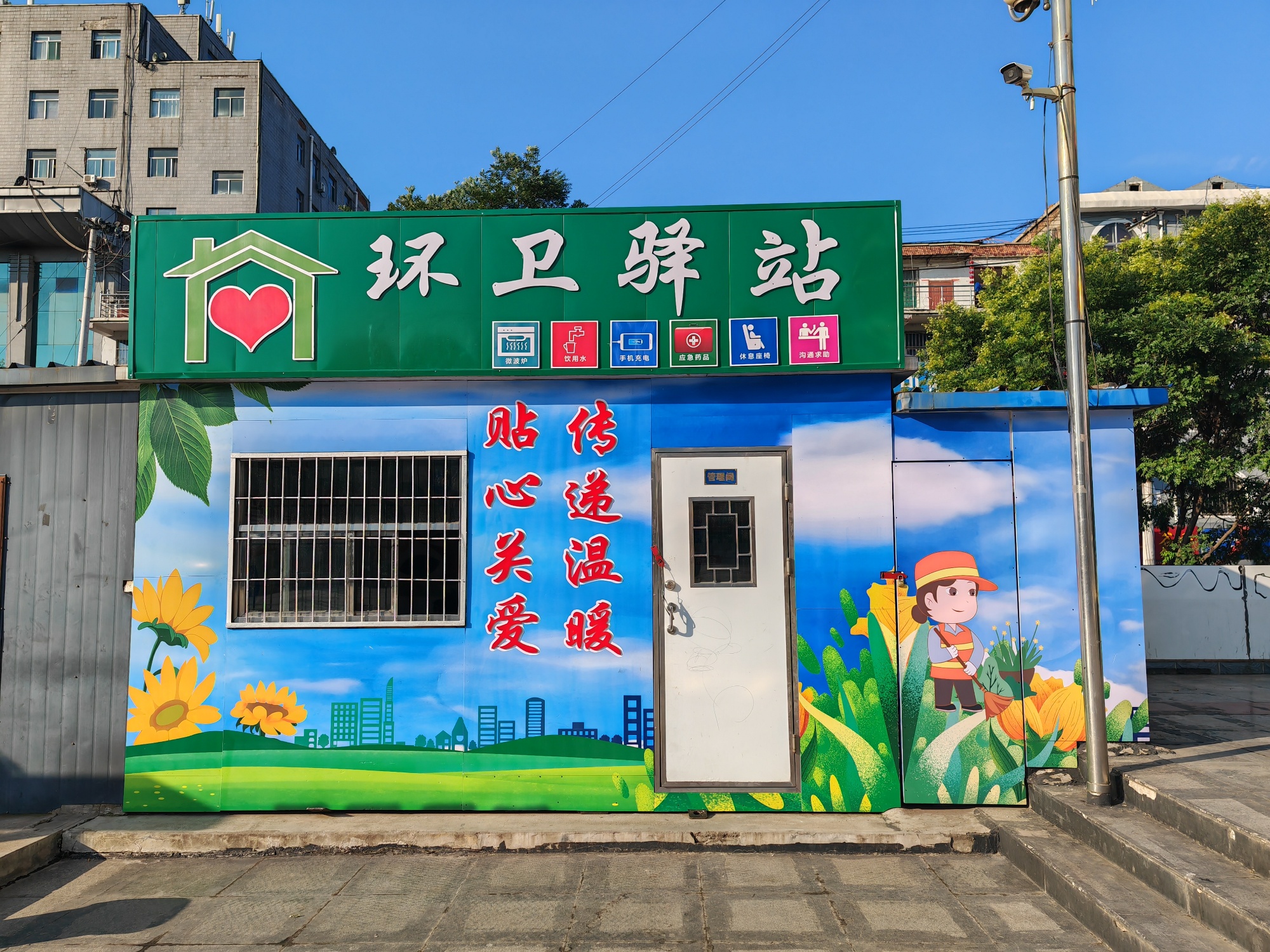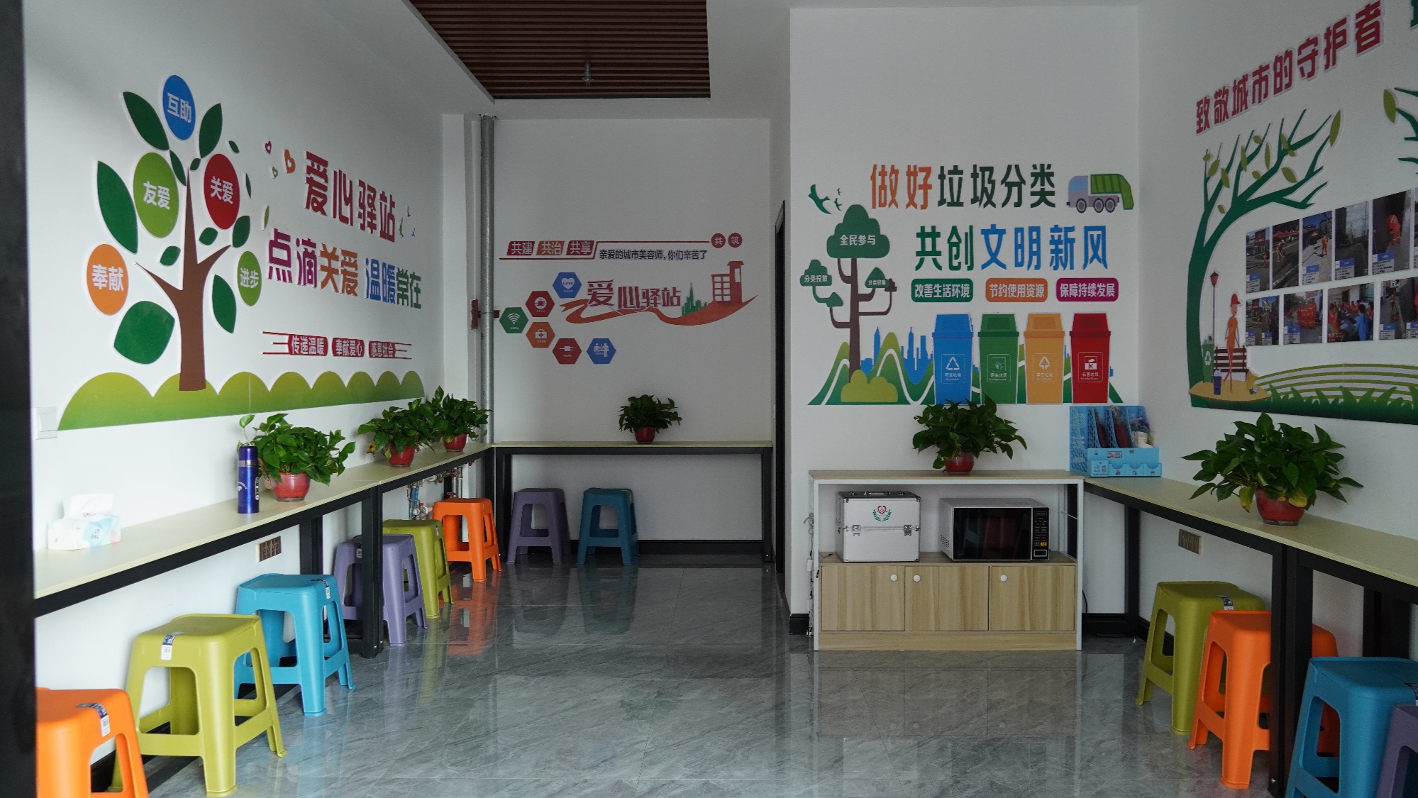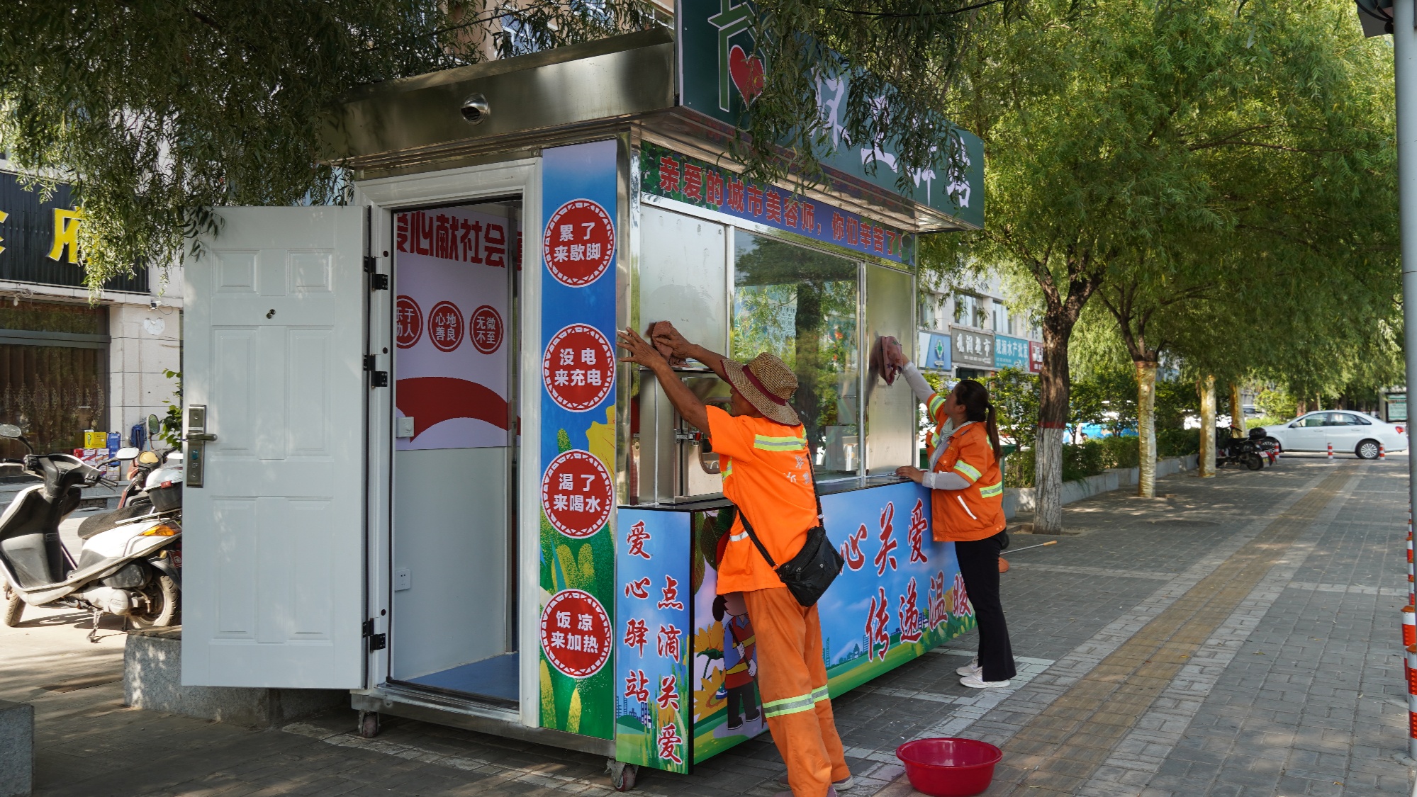 “自从这个爱心驿站建成后,方便了不少。驿站里安装了空调,大家在里边休息,歇下来凉凉快快的。假如我们有时候来不及吃饭,带上点干粮,来了这里还有微波炉,设备齐全,挺好的。”环卫工人李建梅高兴地说到。