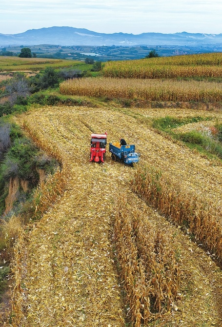 9月21日,山西省晋中市寿阳县平头镇榆城村农民在山地梯田里收割玉米。仲秋时节,黄土高坡山梁沟峁间种植的玉米、谷子等作物陆续成熟,共同织就一幅金秋丰收画卷。(裴晓军)