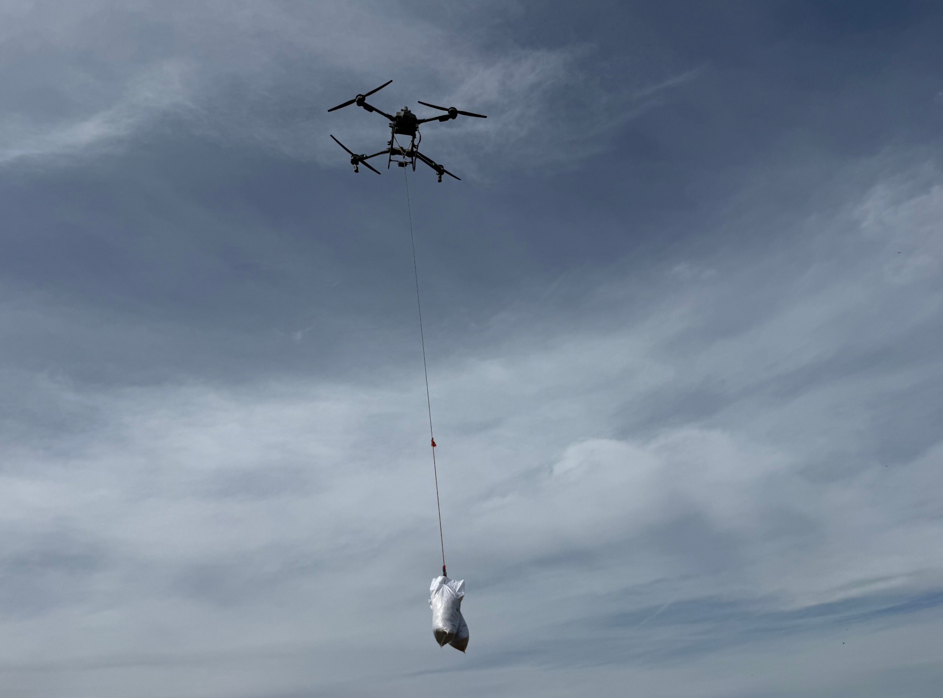 守在田埂上的飞手郭跃明,是个四十来岁的汉子。他盯着控制屏,拇指在操纵杆上轻轻一推,喊了声“走!”。只见悬着的铁钩稳稳扣住袋口,无人机嗡嗡升起,吊着百来斤的谷袋就朝转运点飞去。