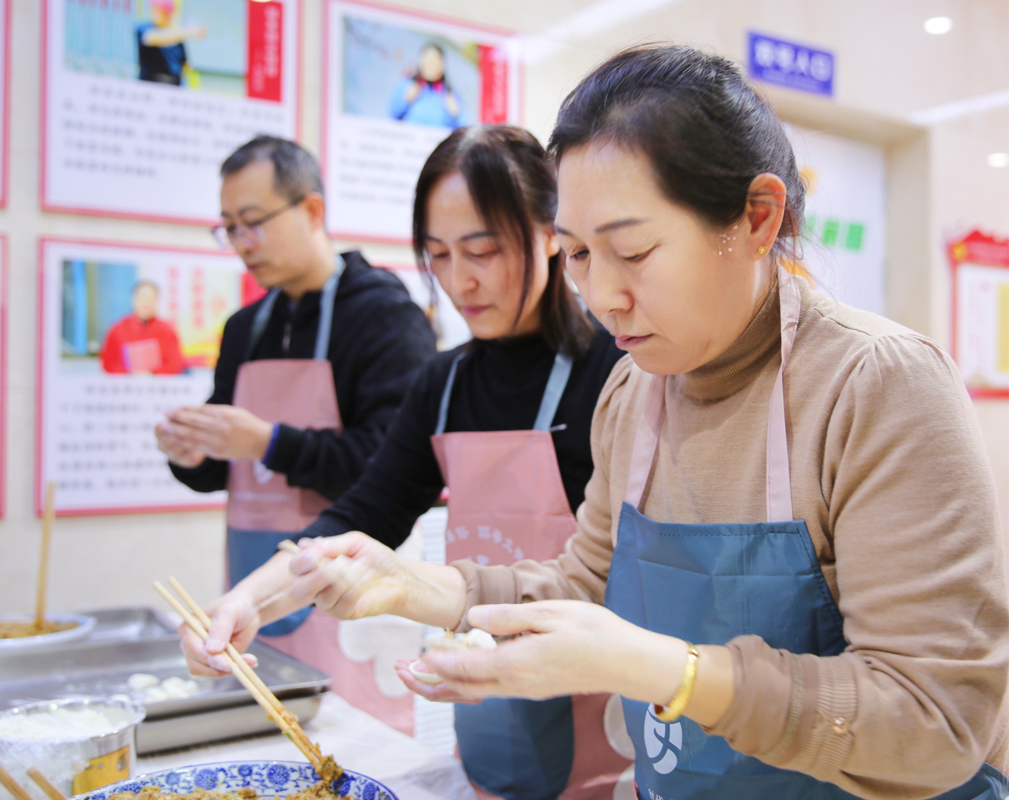 “冬至不端饺子碗,冻掉耳朵没人管。”随着这句俗语在现场响起,包饺子环节正式拉开帷幕。擀好的饺子皮、调好的馅料整齐摆上桌,居民们自由组队、分工协作,捏褶的、填馅的、摆盘的,个个动作娴熟。不一会儿,形态各异的饺子便摆满了托盘,元宝形、月牙形、柳叶形……每一个饺子都包裹着大家的巧思与温情。欢声笑语中,邻里情谊悄然升温,团圆的幸福感溢满整个实践中心。