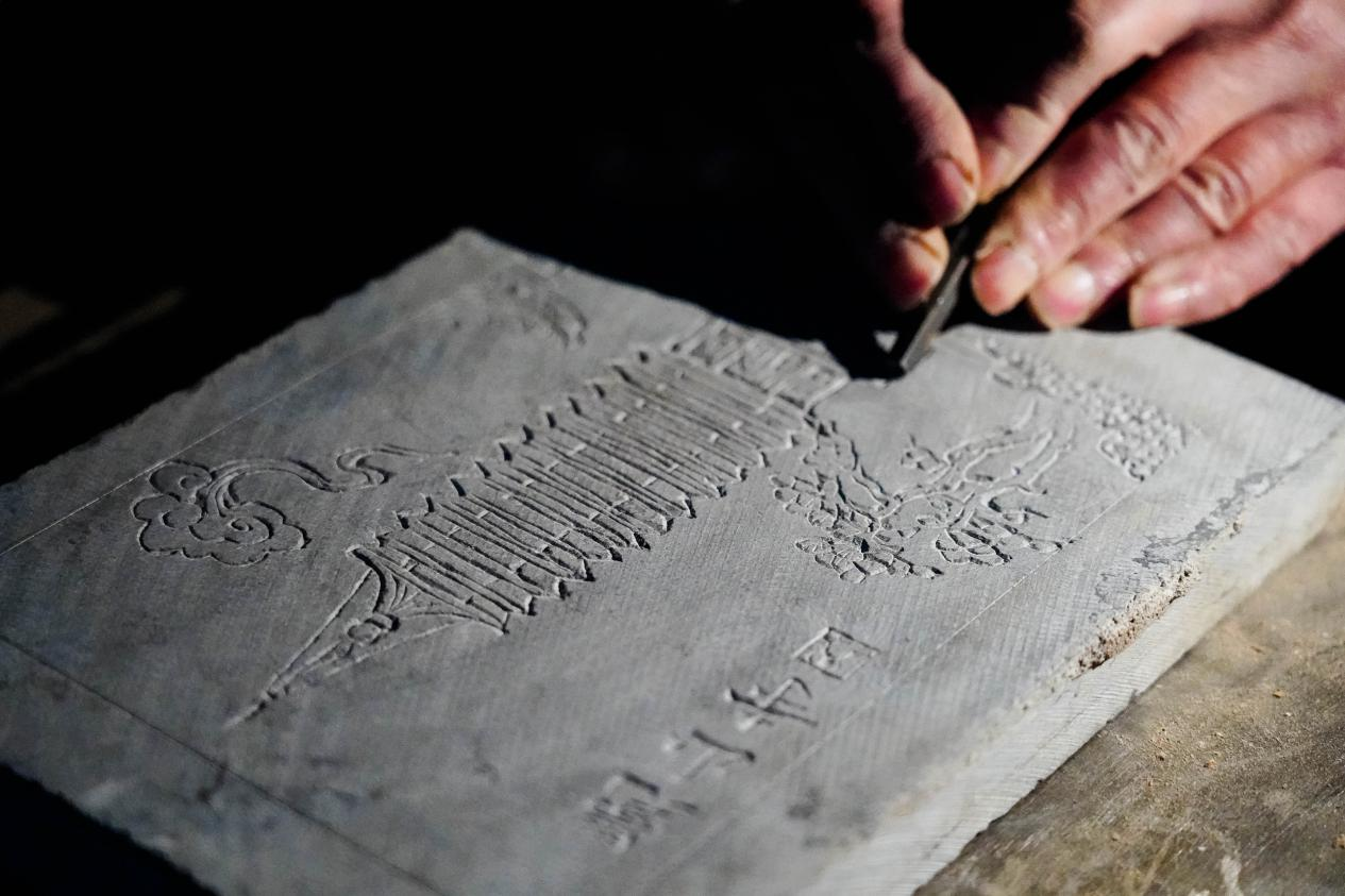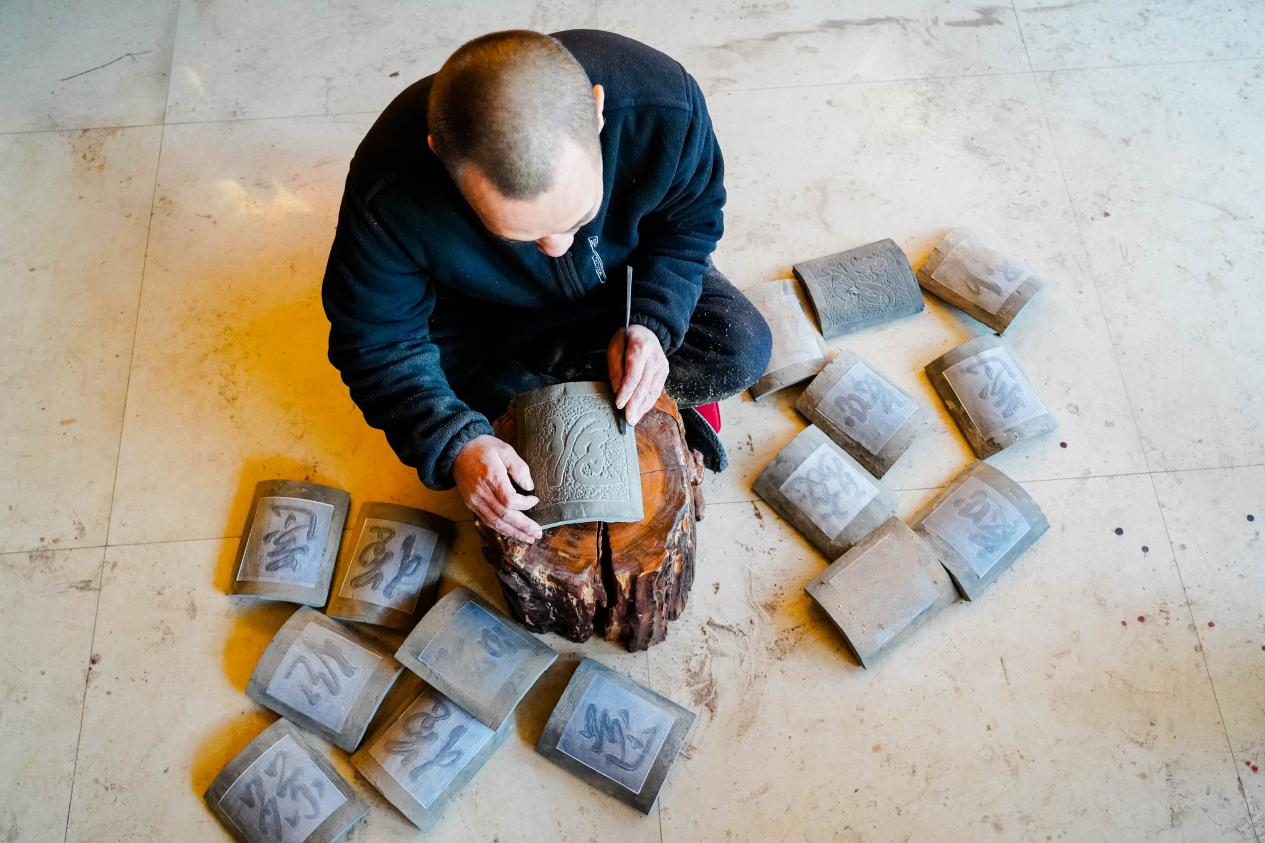 李永红以刀为笔,在砖块上镌刻觉山寺国宝辽代砖塔(占兵 摄)
