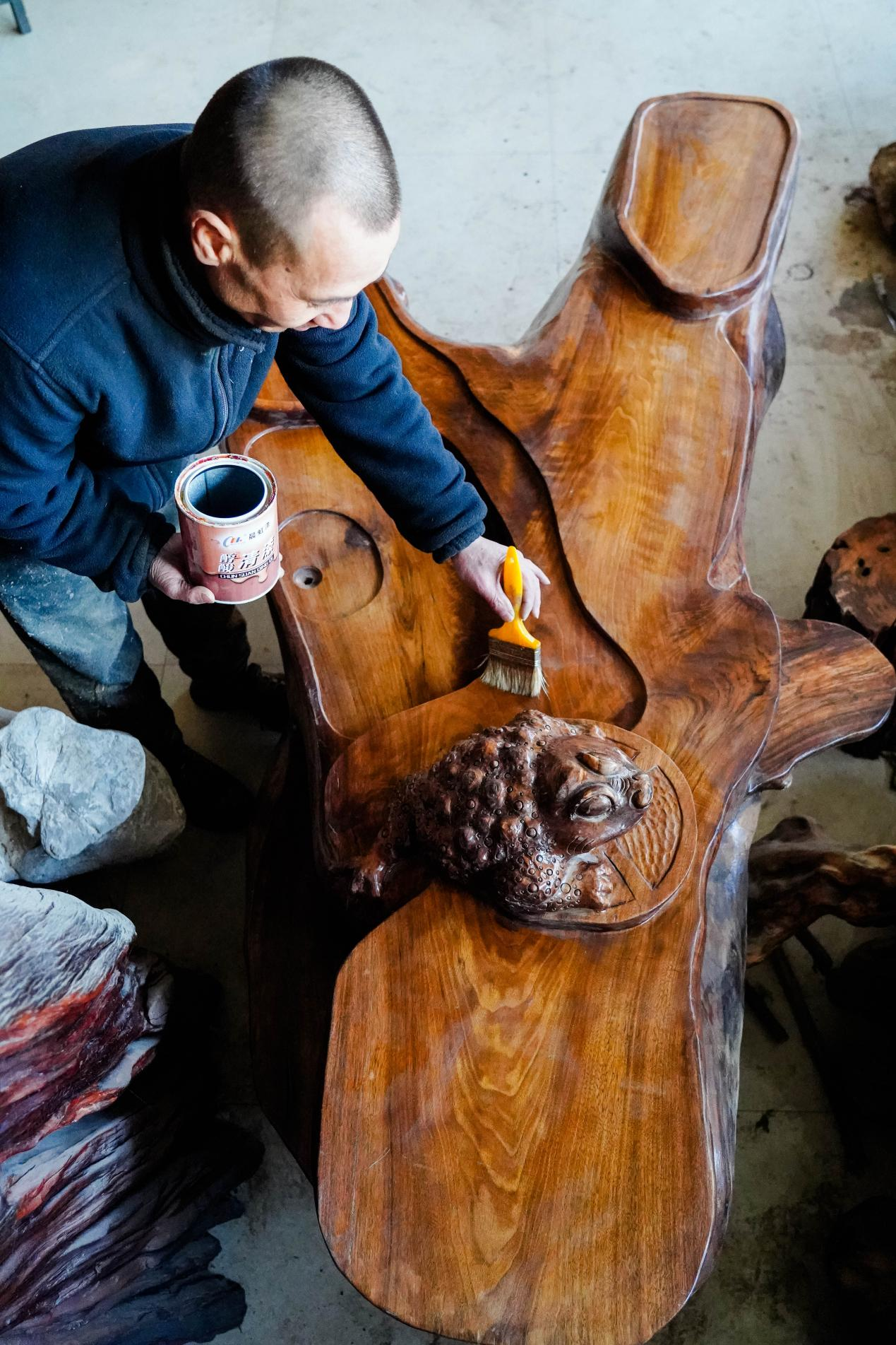 李永红在为根雕茶几作品上漆(占兵 摄)