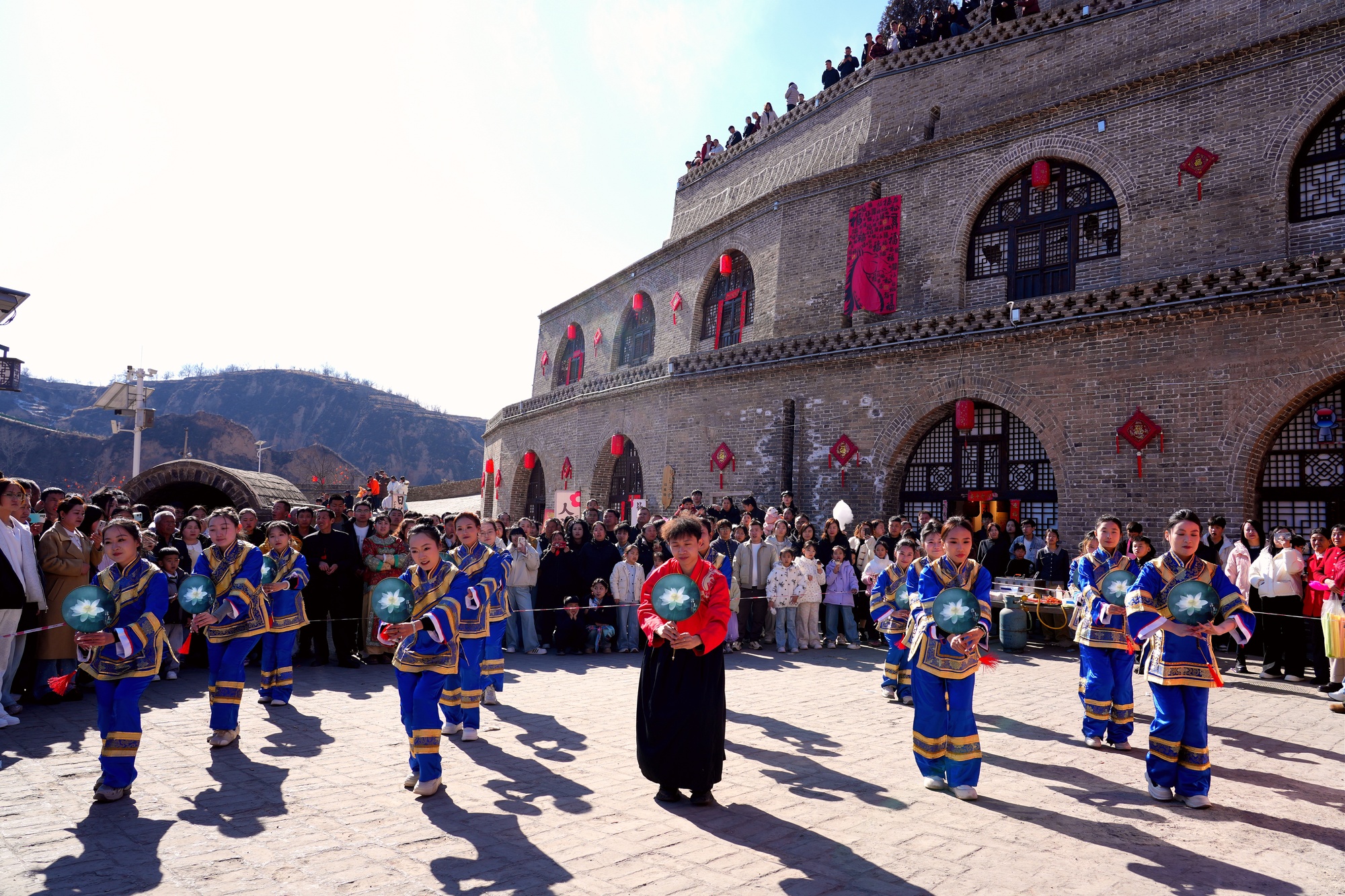步入古村,青石板路蜿蜒纵横,古建院落错落有致,处处张灯结彩、喜气洋洋。古装实景剧抛绣球在古村古建中实景上演,身着传统婚服的演员移步换景、演绎生动,红绸飞扬、喜乐阵阵,游客置身其中沉浸式感受传统婚俗的古典韵味与新春喜庆,仿佛穿越千年,亲身参与一场古韵十足的古村喜事;威风锣鼓铿锵震天、气势磅礴,奏响新春序曲;秧歌队彩衣翩跹、红绸飞舞,尽显民俗风情;非遗唢呐婉转高亢,山西民歌深情悠扬,经典舞蹈轮番上演,展现地域文化底蕴,赢得现场阵阵掌声。
