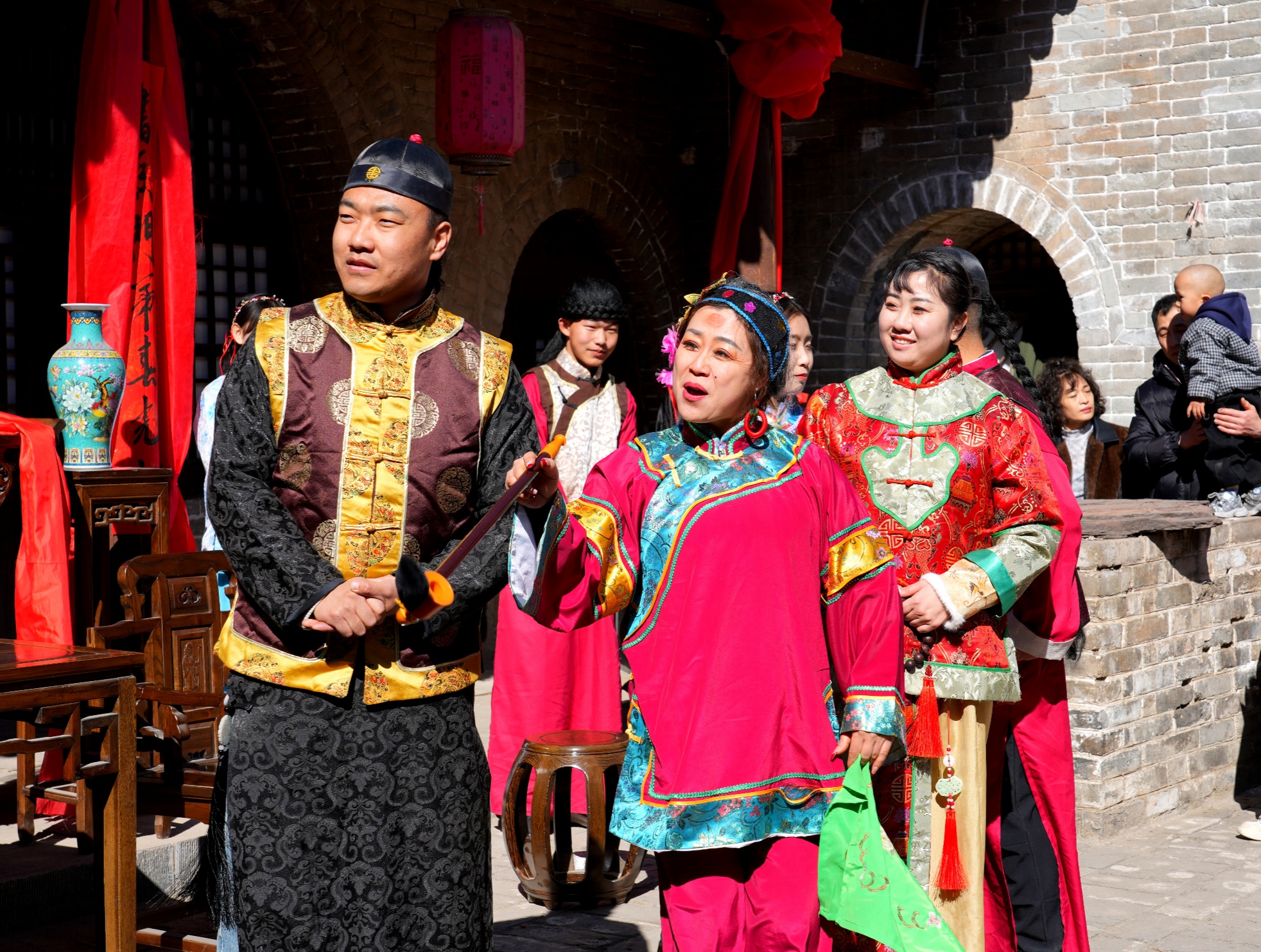 游客赵文宇说:“一走进古村,红灯笼高高挂起,古色古香的建筑特别有年味。刚才看了实景剧抛绣球互动,现场特别热闹,大家都笑得合不拢嘴;还有地道的民歌、非遗唢呐表演,声音一出来,年味直接拉满。”
