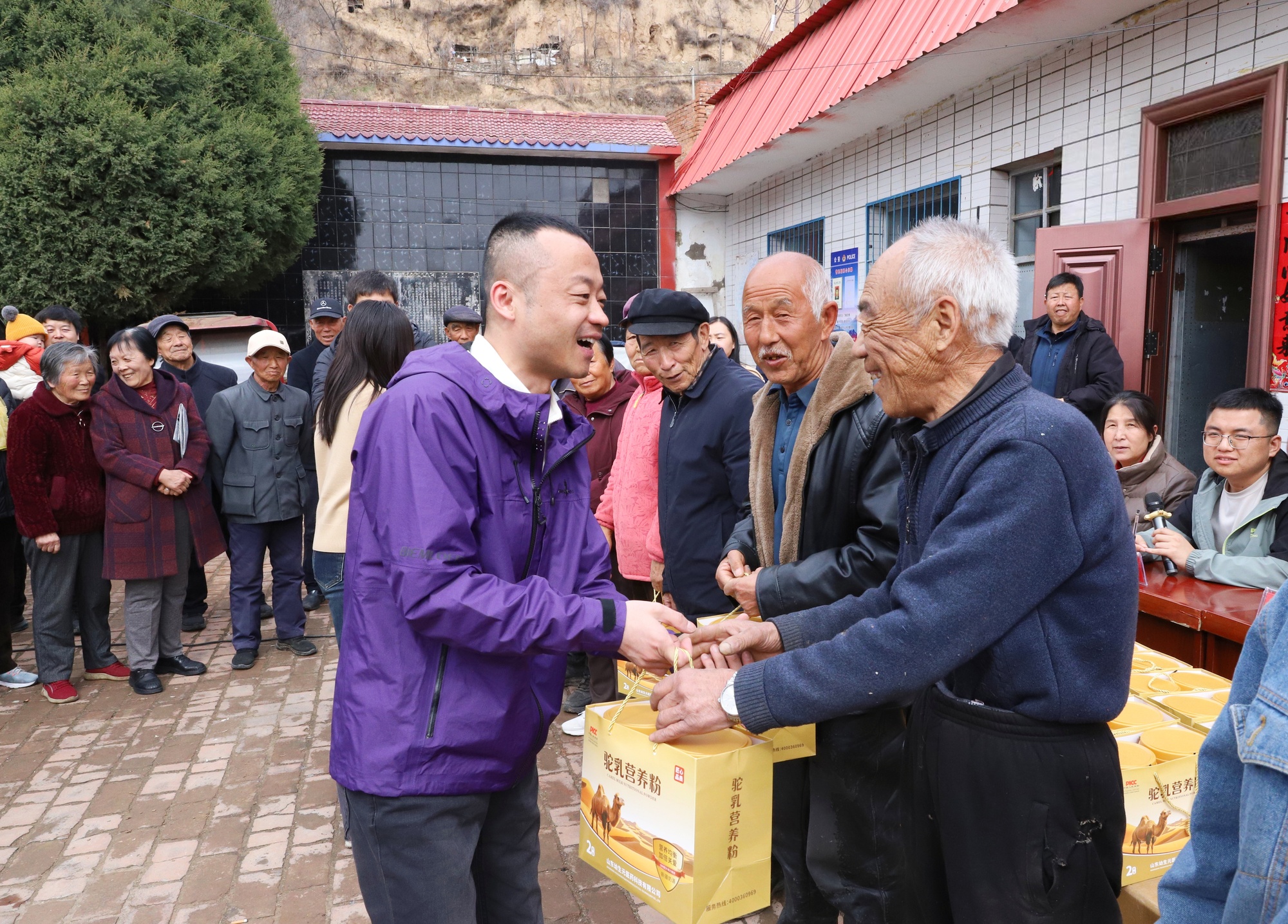 捐赠仪式上,90后青年刘候祥身着朴素衣物,与爱人一同穿梭在老人中间,将一罐罐精心挑选的驼乳营养粉递到他们手中。他没有华丽的辞藻,只是俯身与老人唠家常,关切地询问着他们的身体状况、日常起居。一句句“大爷,最近身体咋样”“大娘,这东西营养足,您记得按时喝”,像春日的暖阳,暖了老人的心房,也让整个院子浸润着温情。