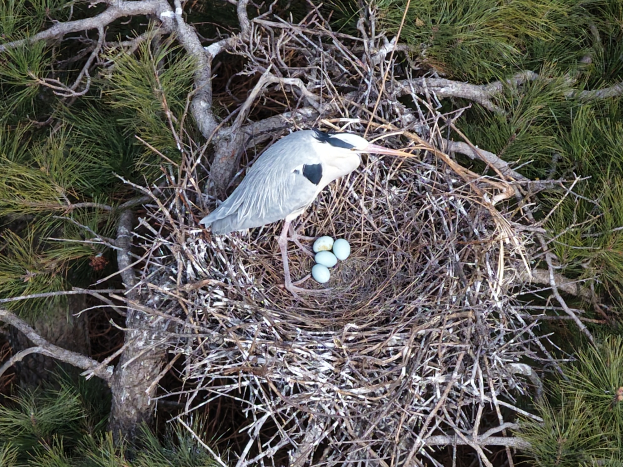 步入苍鹭栖息区,最动人的便是苍鹭孵蛋的温情画面。每一个鸟巢中,都卧着专心孵蛋的苍鹭亲鸟,它们微微收拢修长的脖颈,将柔软的腹部紧紧贴在鸟蛋上,用自身的体温为胚胎发育提供温暖的庇护,全程纹丝不动,尽显母性的温柔与坚韧。孵蛋过程中,亲鸟会时不时抬起头,用细长而尖锐的喙,小心翼翼地轻轻翻动巢中的鸟蛋,动作轻柔缓慢,生怕磕碰分毫,确保每一枚鸟蛋都能均匀受热,让胚胎顺利发育。一旁值守的伴侣则寸步不离,静立在巢穴旁的枝桠上,身姿挺拔、目光警惕,时刻留意着周边动静,一旦有陌生声响或异物靠近,便会发出低沉的鸣叫警示,全力守护巢穴与蛋卵安全。