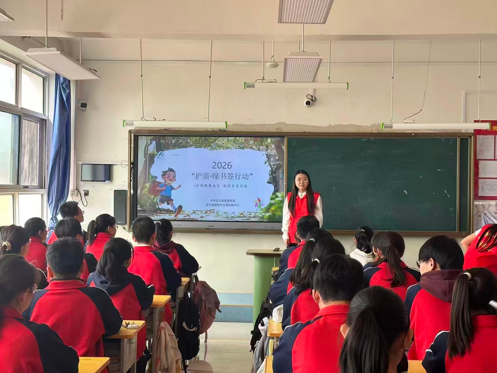 央广网大同4月27日消息(记者张洁 通讯员刘新宇)近日,中共左云县委宣传部、左云县新时代文明实践中心联合左云县图书馆走进山西省左云县二中,开展2026年“护苗·绿书签行动”主题活动。活动以“护助健康成长拒绝有害内容”为核心,融合读书分享、知识宣讲、互动科普等多元形式,护助青少年健康成长,推动形成爱读书、读好书、善读书的浓厚校园氛围。