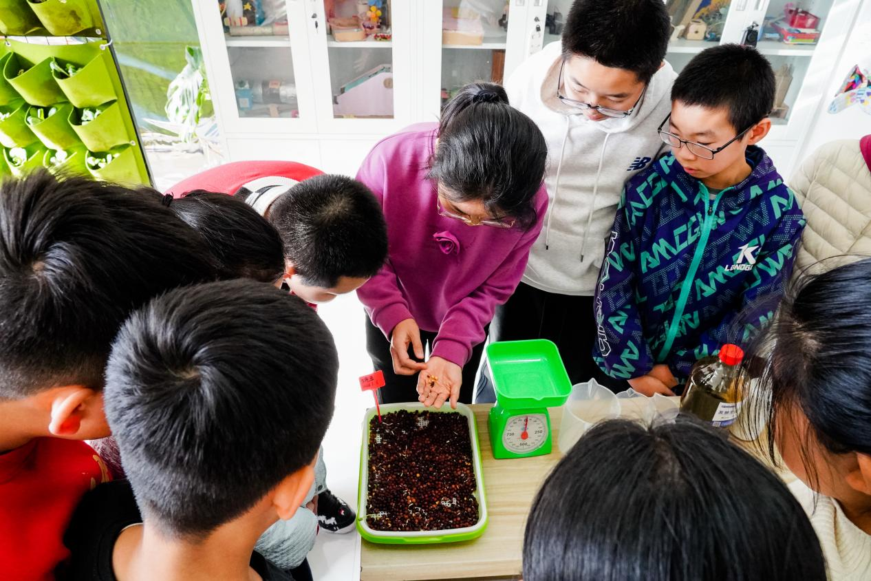 老师和学生一起在选种(张宗昌 摄)