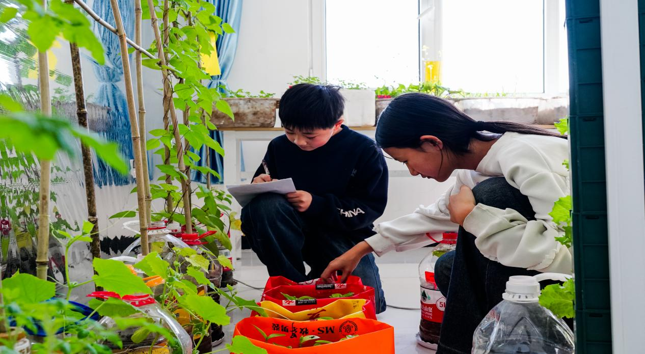 近日,山西大同市灵丘县育英小学六年级的孩子们在一间教室的“立体小菜园”中,认真观察并记录着蔬菜的生长变化。