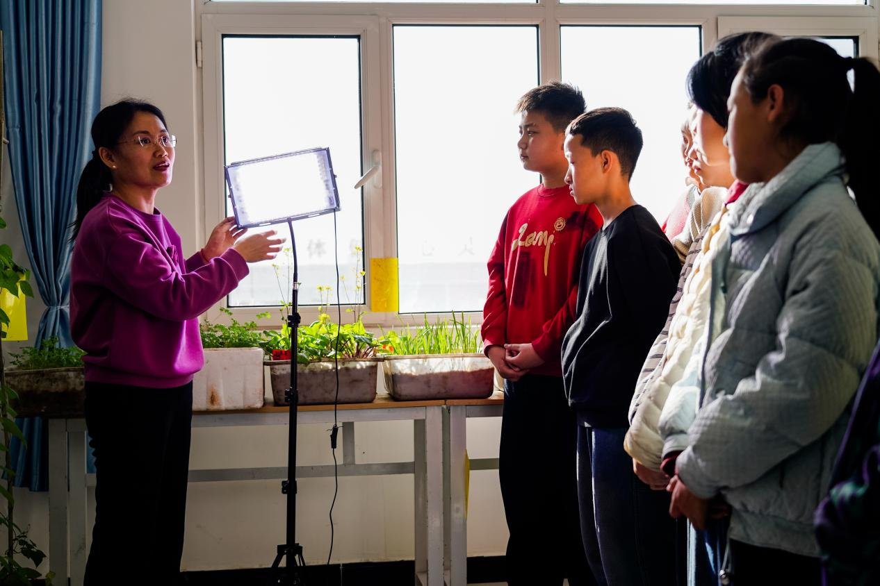 徐晓艳和学生们研究利用补光灯,让蔬菜接受更多的光照(灵丘县委宣传部供图)