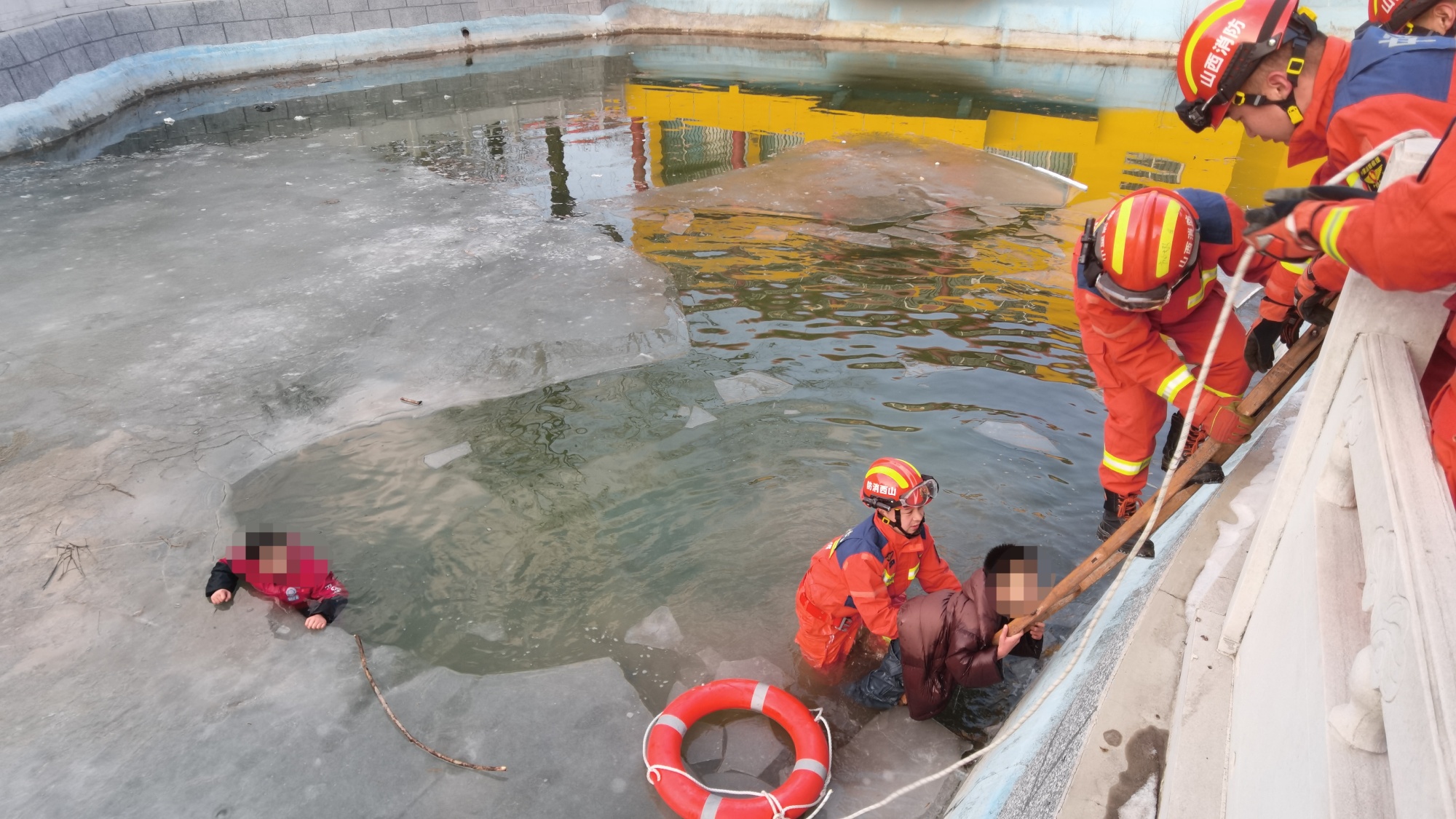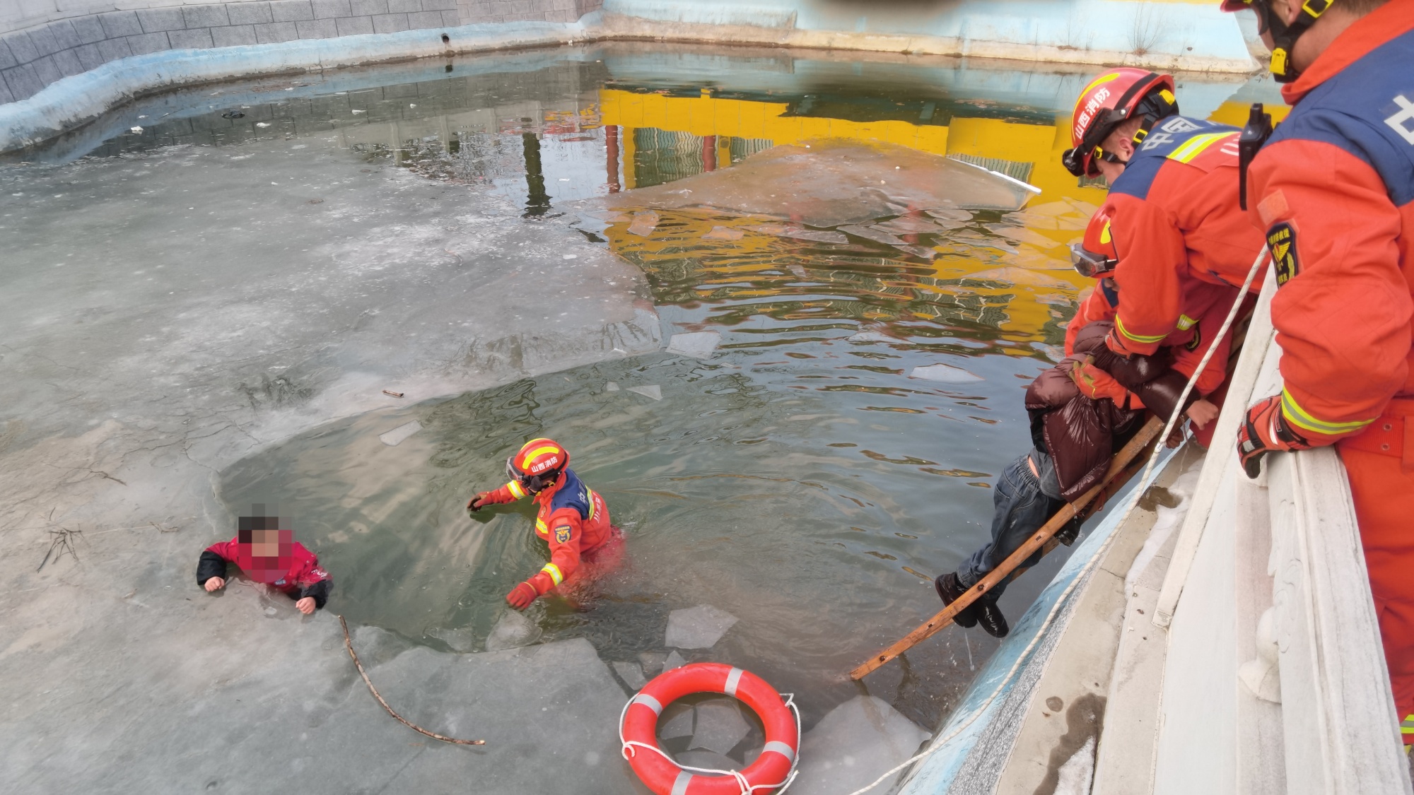 “赶到现场后,看到湖面一面结冰一面化开,两个孩子下半身在水里,上半身胳膊死死抓着冰面,冰面随时可能塌陷,孩子随时会掉落,情况非常紧急,我们迅速制定方案。”方山县消防救援大队政府专职队班长陶茂林介绍。面对紧急情况,现场指挥员当即敲定救援方案,迅速展开救援行动:一名队员穿戴全套防护装备,系好安全绳后借助挂钩梯小心翼翼深入冰面实施救援,其余队员在岸边稳固绳索、密切观察现场情况,随时做好接应准备。