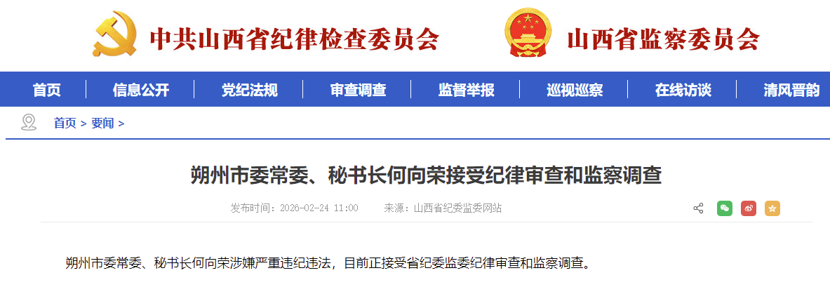 朔州市委常委、秘书长何向荣涉嫌严重违纪违法,目前正接受山西省纪委监委纪律审查和监察调查。