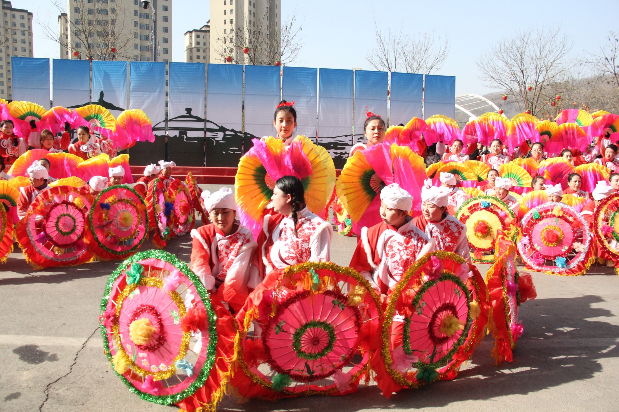 展演现场亮点纷呈、好戏连台:伞头领唱韵味悠长,双扇花伞队舞姿灵动曼妙,腰鼓队节奏明快有力,背棍铁棍表演惊险又惊艳,左国城民族融合展演队更是将多元民俗风情展现得淋漓尽致。精彩的表演引得过往市民纷纷驻足观看、拍照留念,掌声、欢呼声、笑声交织在一起,汇成了一曲欢乐的新春赞歌。