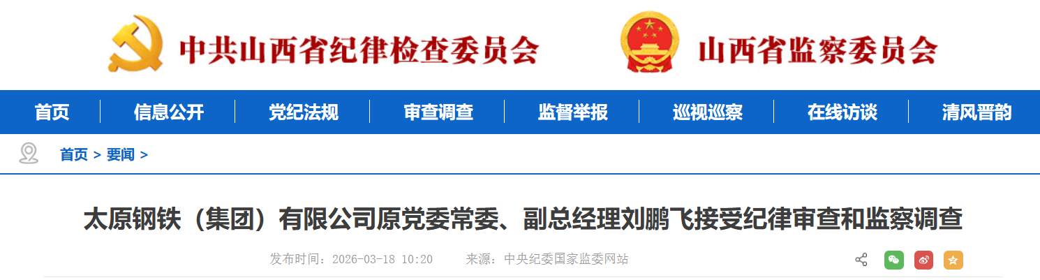 央广网太原3月18日消息(记者张晋鹏)据中央纪委国家监委驻中国宝武纪检监察组、山西省纪委监委消息:太原钢铁(集团)有限公司原党委常委、副总经理刘鹏飞涉嫌严重违纪违法,目前正接受中央纪委国家监委驻中国宝武纪检监察组纪律审查和山西省监察委员会监察调查。