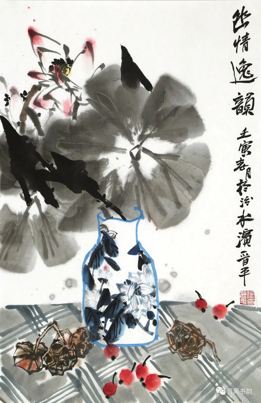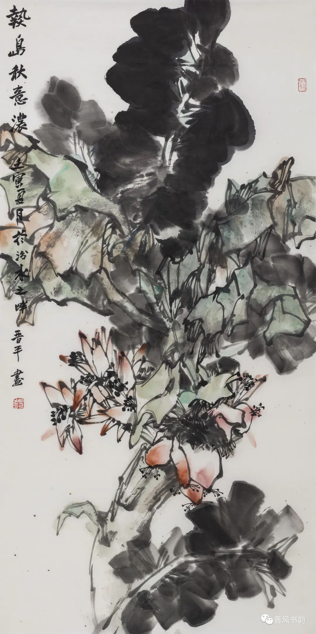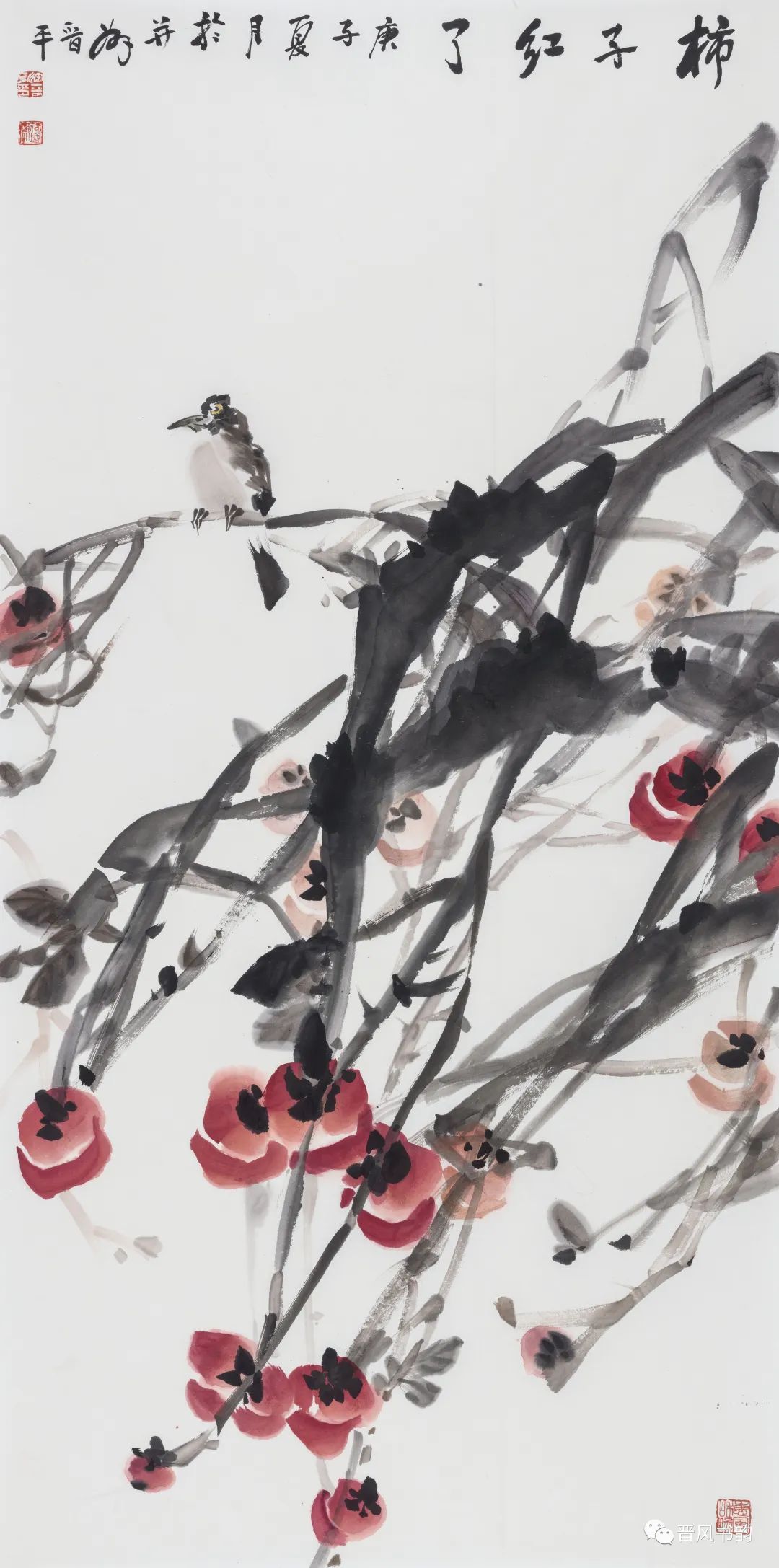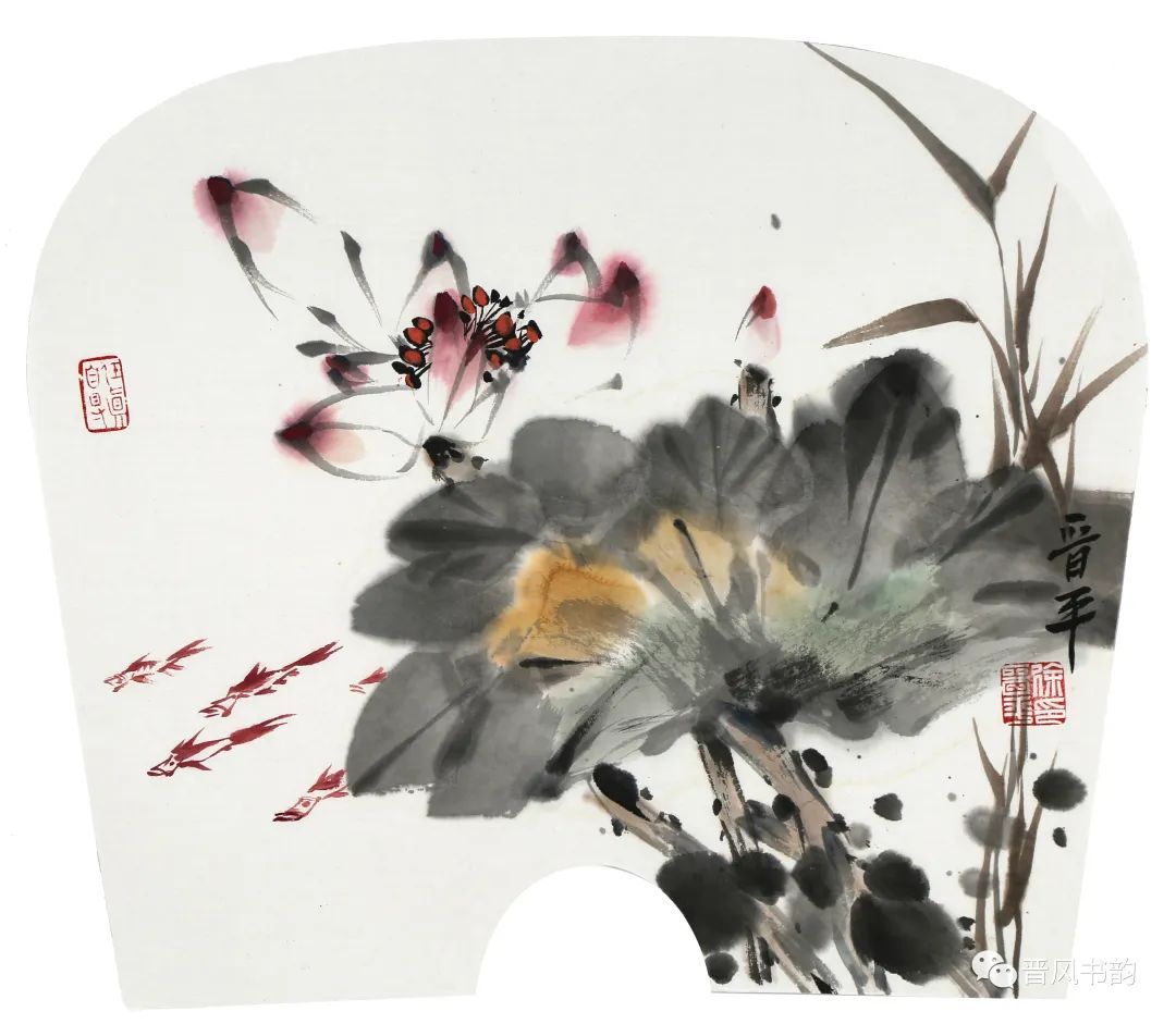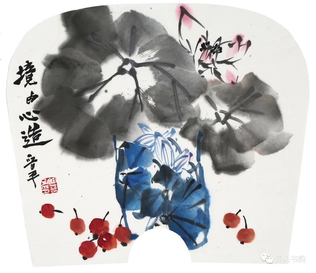 山西是中国历史渊源深厚久远的文化大省。保存着中国最多的地面历史文物。走在三晋大地,几乎处处可以邂逅、遭遇到你神往已久的以前只是在教科书里读过的历史。山西的绘画则可以看到从汉唐到明清绵延两千年壁画熏陶的气息。我想,徐晋平先生的花鸟画首先带来的是他的不同于江南的文化传统和文化积淀。习惯了江南丹青的花鸟画,今天再走进徐晋平先生的花鸟世界,的确是另一个洞天另一番气象。让我们耳目一新。原来温情万种的花鸟,也可以让我们如此的血脉贲张,汹涌澎湃。他给我们带来了北方秋天的柿子、石榴。它们已经不是我们常见的传统花鸟画里喜庆吉祥的民间文化的符号。那是经过了高原的阳光直射,又经受了凛冽的朔风和霜冻的考验,在即将飘落的秋叶中顽强自我表现着的一种存在。它们都不是那么圆润光爽。我特别注意到他笔下的石榴石榴的皮用墨色渲染、皴擦,大有“却道天凉好个秋”的意味。经常那是中国北方民众在与相对严酷的自然环境中生存意志和精神力量的显现。徐晋平学习西画的对现实生活的观察力和东方美学主观意念的抒情表达,得到了统一的彰显。比如,柿子中间的那根腰线就得力于观察和变形,十分的耐看。徐晋平荷花是向上的,但不是轻而易举的往上走,而是有点努力、挣扎的向上。包括那些荷叶,硕大孔武,充满着视觉张力。用墨自由奔放酣畅洒脱,线条的粗狂强悍。在构图上线条密集交错,转折处沉郁顿挫遒劲有力,古乐府唱道,江南可采莲。其实汾河的哗哗流水里同样可采莲。只不过莲花的气质有了不同而已。徐晋平的花鸟画基本以写意为主,大小写结合,以气势和力量见长。有时候更在山西雄山大川背景下展开。特别是,他早年学习西画的经历,使他在花鸟画的用色上显得特别出挑,给人以俏丽出新的喜悦。局部的细节处理上也是有温情动人之处。