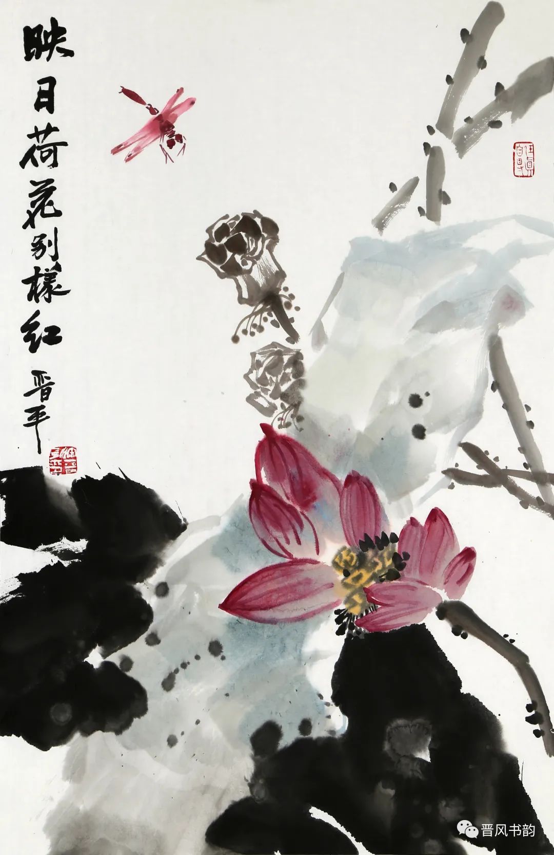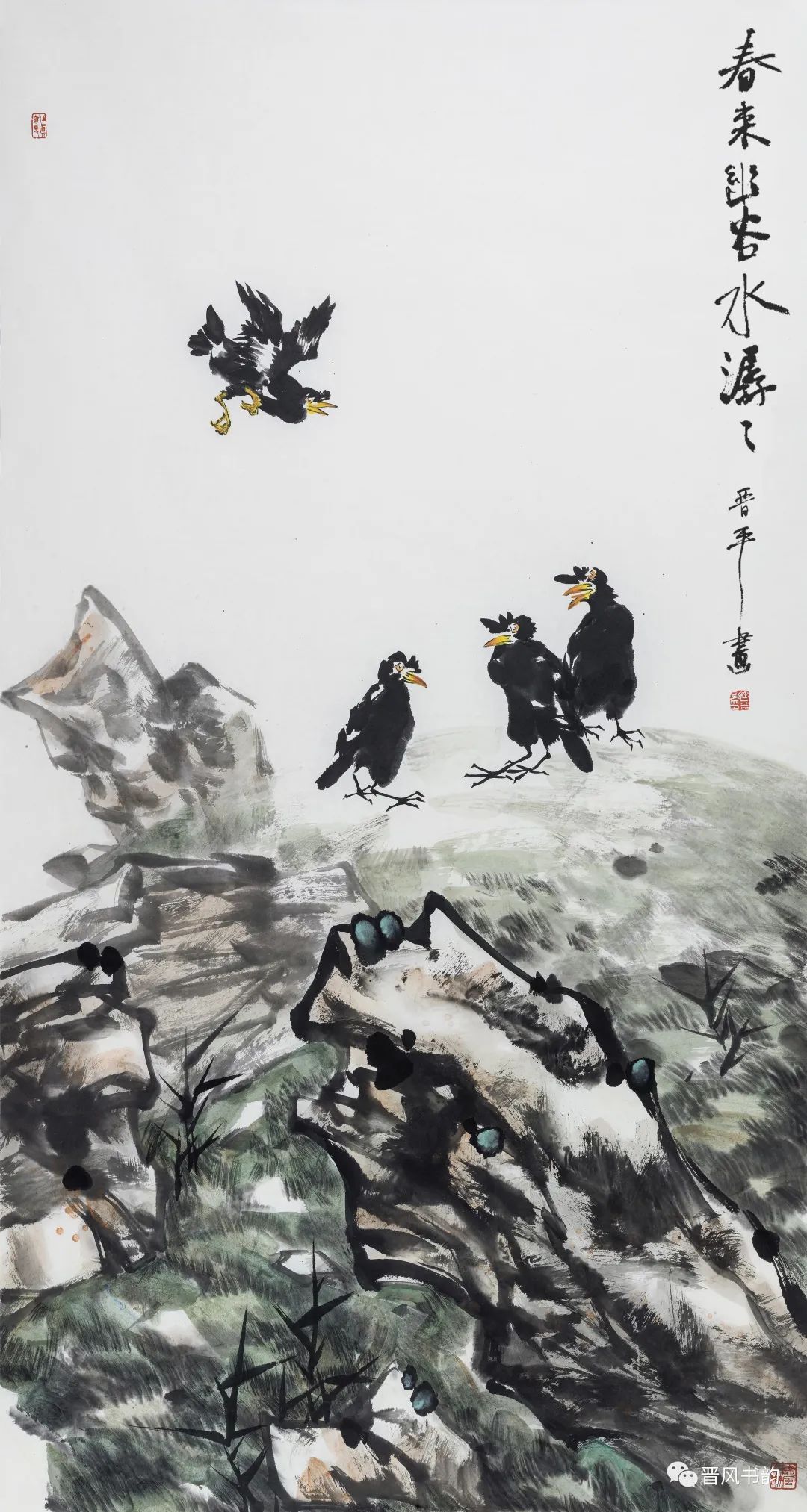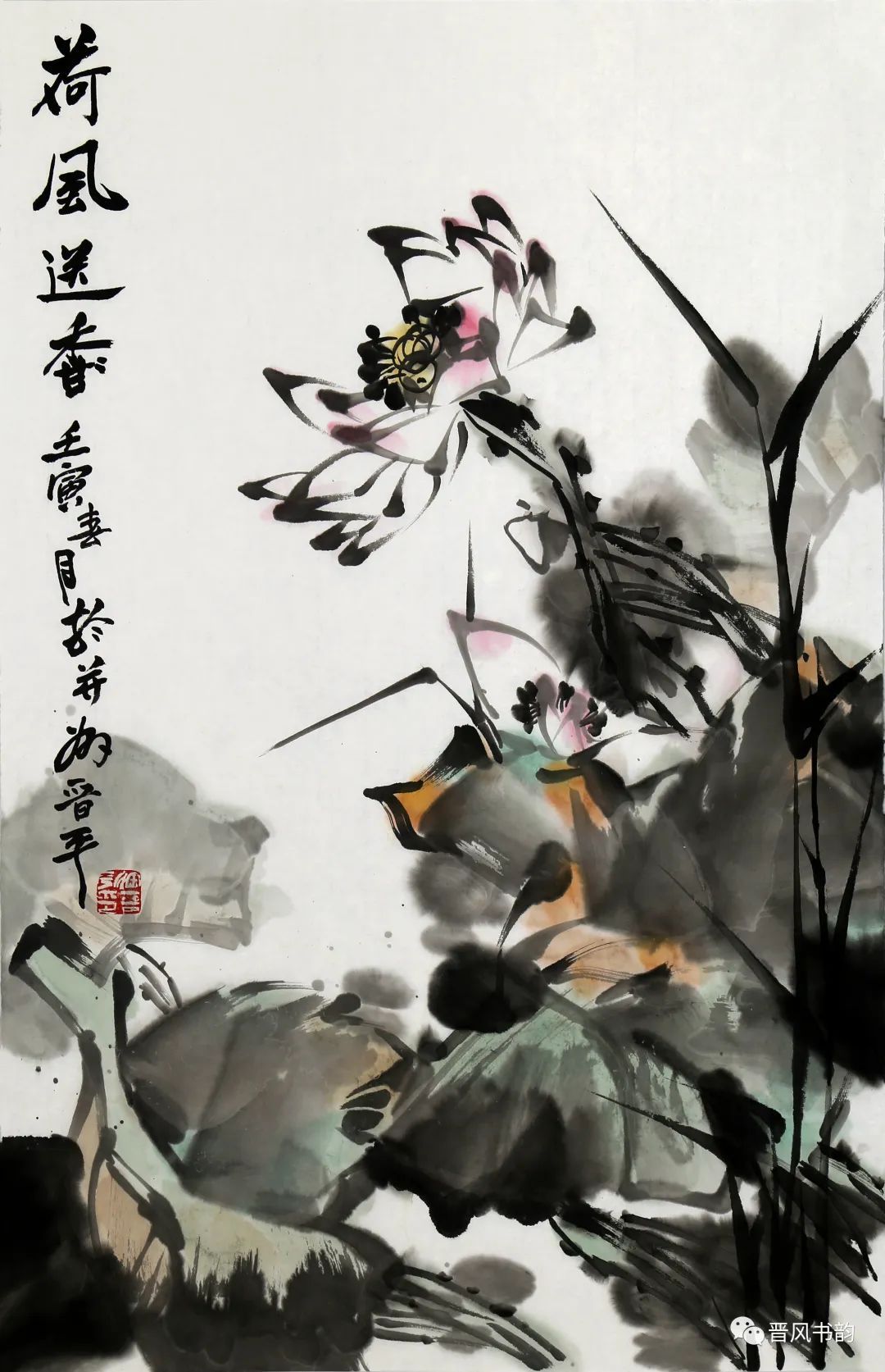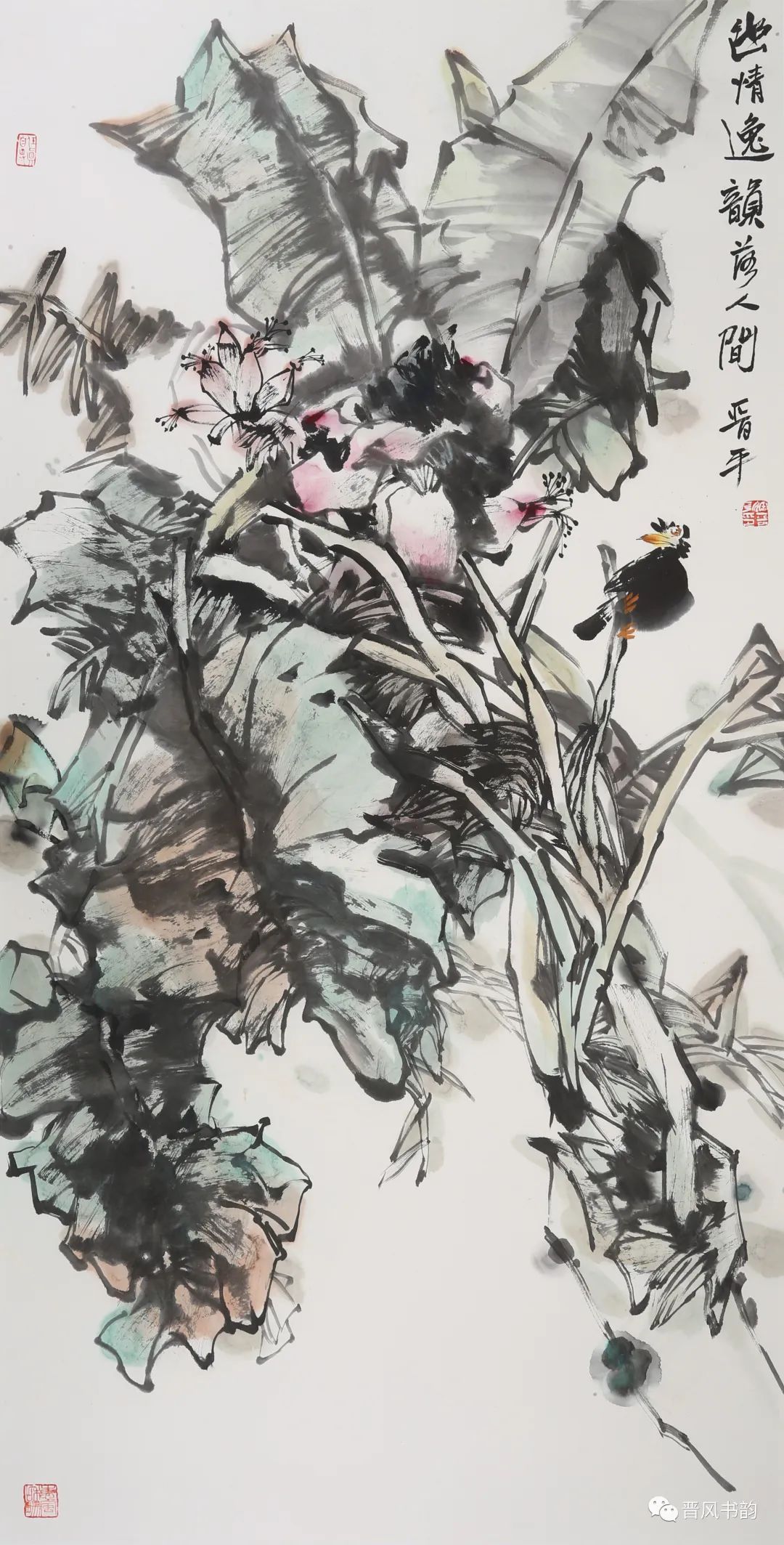 山西是中国历史渊源深厚久远的文化大省。保存着中国最多的地面历史文物。走在三晋大地,几乎处处可以邂逅、遭遇到你神往已久的以前只是在教科书里读过的历史。山西的绘画则可以看到从汉唐到明清绵延两千年壁画熏陶的气息。我想,徐晋平先生的花鸟画首先带来的是他的不同于江南的文化传统和文化积淀。习惯了江南丹青的花鸟画,今天再走进徐晋平先生的花鸟世界,的确是另一个洞天另一番气象。让我们耳目一新。原来温情万种的花鸟,也可以让我们如此的血脉贲张,汹涌澎湃。他给我们带来了北方秋天的柿子、石榴。它们已经不是我们常见的传统花鸟画里喜庆吉祥的民间文化的符号。那是经过了高原的阳光直射,又经受了凛冽的朔风和霜冻的考验,在即将飘落的秋叶中顽强自我表现着的一种存在。它们都不是那么圆润光爽。我特别注意到他笔下的石榴石榴的皮用墨色渲染、皴擦,大有“却道天凉好个秋”的意味。经常那是中国北方民众在与相对严酷的自然环境中生存意志和精神力量的显现。徐晋平学习西画的对现实生活的观察力和东方美学主观意念的抒情表达,得到了统一的彰显。比如,柿子中间的那根腰线就得力于观察和变形,十分的耐看。徐晋平荷花是向上的,但不是轻而易举的往上走,而是有点努力、挣扎的向上。包括那些荷叶,硕大孔武,充满着视觉张力。用墨自由奔放酣畅洒脱,线条的粗狂强悍。在构图上线条密集交错,转折处沉郁顿挫遒劲有力,古乐府唱道,江南可采莲。其实汾河的哗哗流水里同样可采莲。只不过莲花的气质有了不同而已。徐晋平的花鸟画基本以写意为主,大小写结合,以气势和力量见长。有时候更在山西雄山大川背景下展开。特别是,他早年学习西画的经历,使他在花鸟画的用色上显得特别出挑,给人以俏丽出新的喜悦。局部的细节处理上也是有温情动人之处。