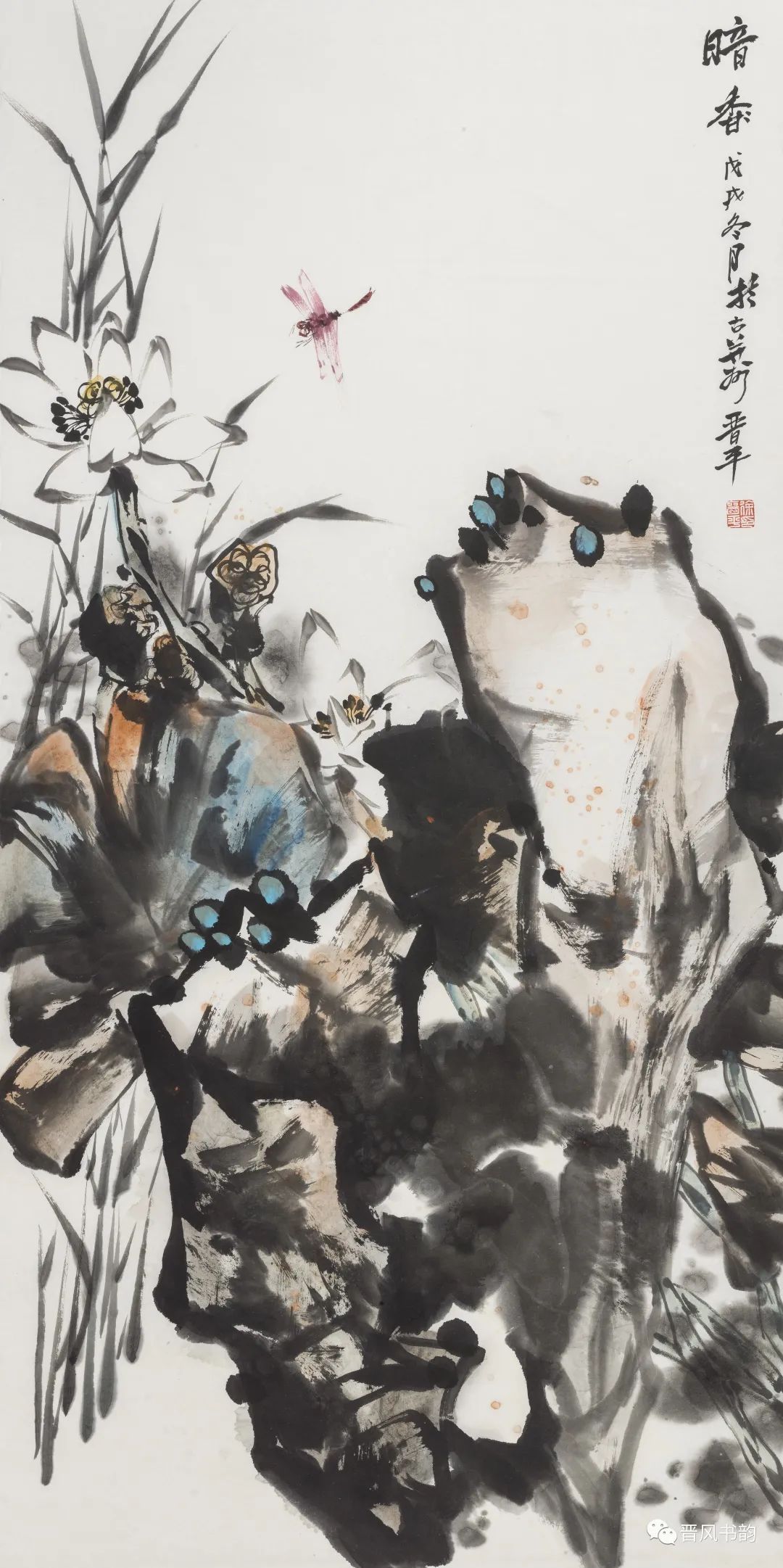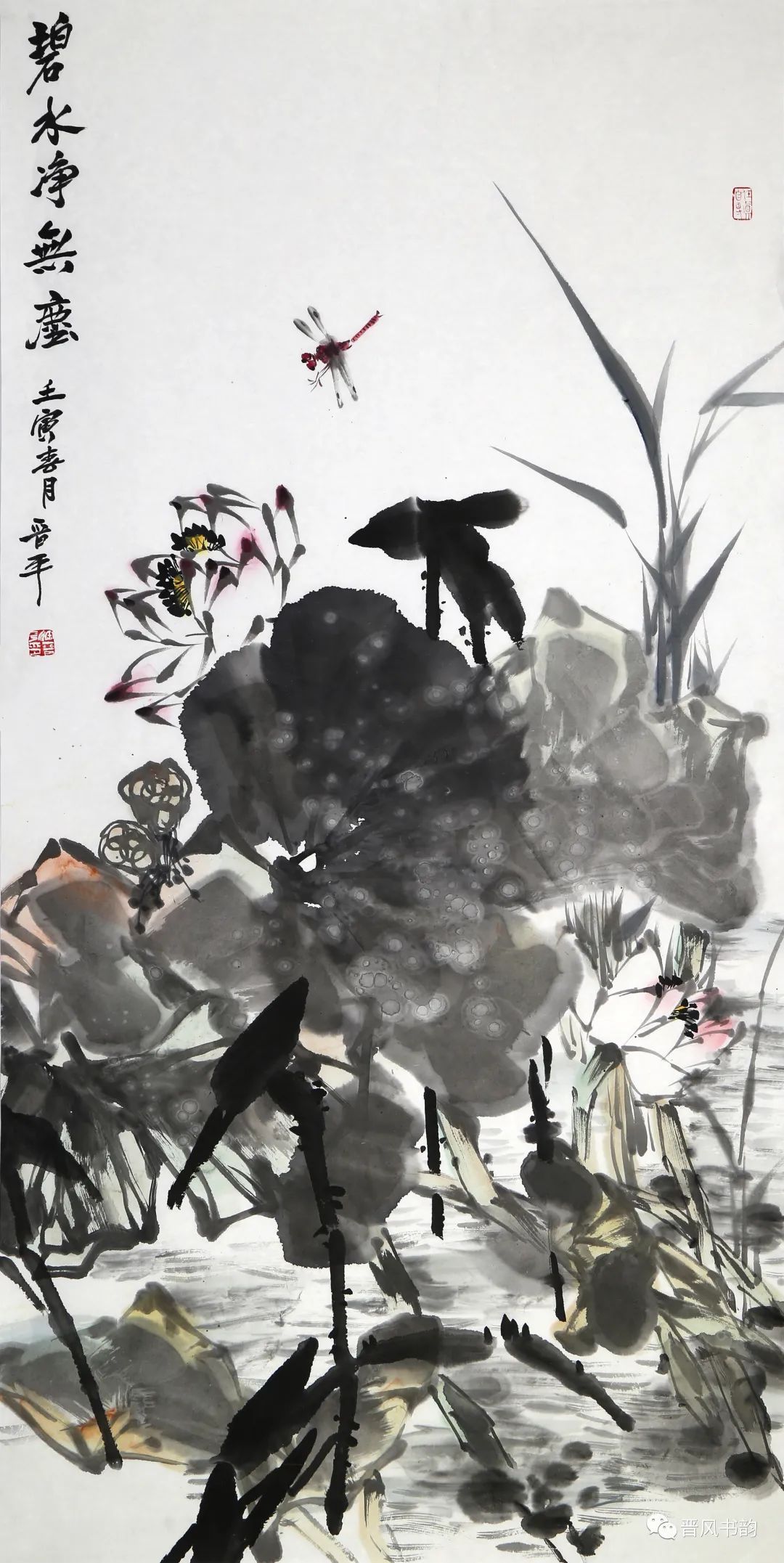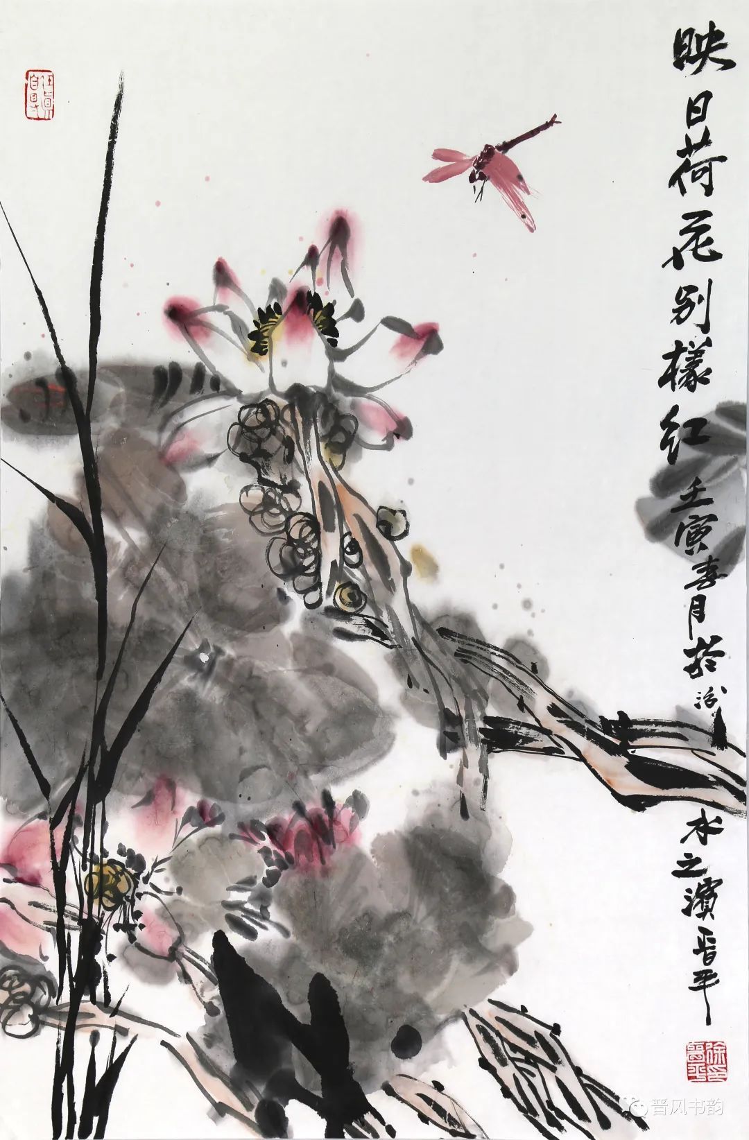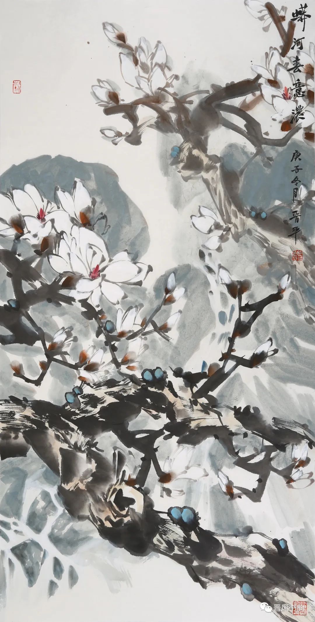 山西是中国历史渊源深厚久远的文化大省。保存着中国最多的地面历史文物。走在三晋大地,几乎处处可以邂逅、遭遇到你神往已久的以前只是在教科书里读过的历史。山西的绘画则可以看到从汉唐到明清绵延两千年壁画熏陶的气息。我想,徐晋平先生的花鸟画首先带来的是他的不同于江南的文化传统和文化积淀。习惯了江南丹青的花鸟画,今天再走进徐晋平先生的花鸟世界,的确是另一个洞天另一番气象。让我们耳目一新。原来温情万种的花鸟,也可以让我们如此的血脉贲张,汹涌澎湃。他给我们带来了北方秋天的柿子、石榴。它们已经不是我们常见的传统花鸟画里喜庆吉祥的民间文化的符号。那是经过了高原的阳光直射,又经受了凛冽的朔风和霜冻的考验,在即将飘落的秋叶中顽强自我表现着的一种存在。它们都不是那么圆润光爽。我特别注意到他笔下的石榴石榴的皮用墨色渲染、皴擦,大有“却道天凉好个秋”的意味。经常那是中国北方民众在与相对严酷的自然环境中生存意志和精神力量的显现。徐晋平学习西画的对现实生活的观察力和东方美学主观意念的抒情表达,得到了统一的彰显。比如,柿子中间的那根腰线就得力于观察和变形,十分的耐看。徐晋平荷花是向上的,但不是轻而易举的往上走,而是有点努力、挣扎的向上。包括那些荷叶,硕大孔武,充满着视觉张力。用墨自由奔放酣畅洒脱,线条的粗狂强悍。在构图上线条密集交错,转折处沉郁顿挫遒劲有力,古乐府唱道,江南可采莲。其实汾河的哗哗流水里同样可采莲。只不过莲花的气质有了不同而已。徐晋平的花鸟画基本以写意为主,大小写结合,以气势和力量见长。有时候更在山西雄山大川背景下展开。特别是,他早年学习西画的经历,使他在花鸟画的用色上显得特别出挑,给人以俏丽出新的喜悦。局部的细节处理上也是有温情动人之处。