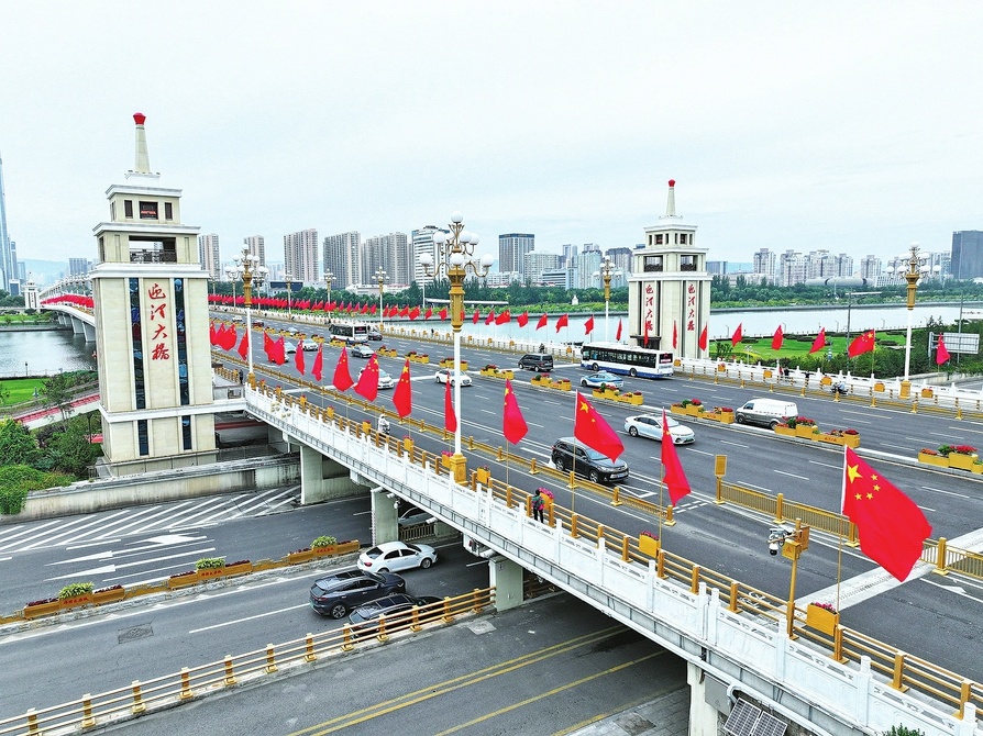9月18日,省城迎泽大桥两旁,一面面五星红旗迎风招展、鲜艳夺目。随着国庆节日益临近,全省各地道路两旁、商业街区、景区景点等开始悬挂国旗,营造出热烈喜庆的氛围。(记者 王瑞瑞)
