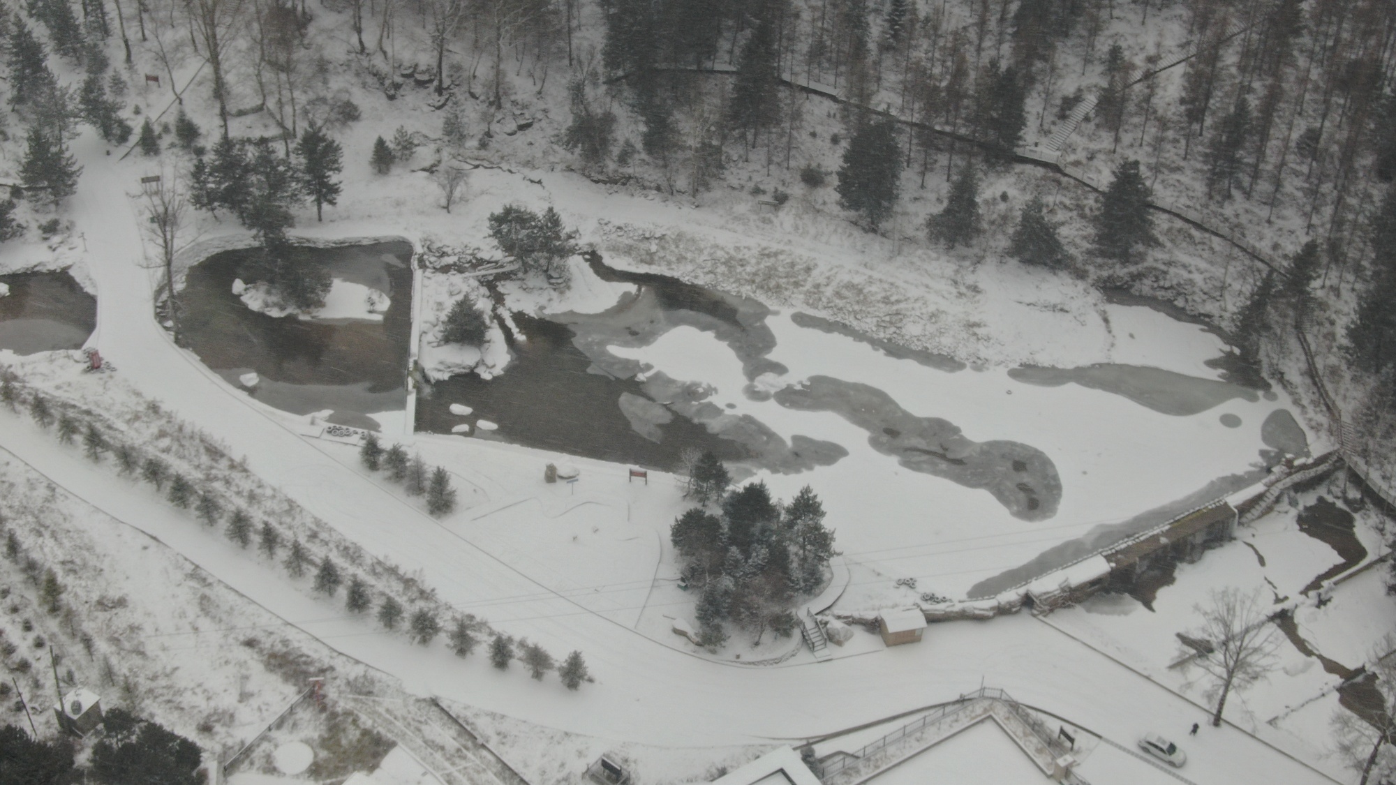 溪流与瀑布是雪中最灵动的景致。十里清溪在皑皑白雪间蜿蜒,水面蒸腾的薄雾与雪气交融,让溪流似隐似现,宛如银绸缠绕山间。小型瀑布部分凝结成冰,晶莹的冰挂与流动的溪水相映成趣,水珠滴落时溅起的水花沾在石上,瞬间凝成冰晶,构成动静结合的画面。溪边的苔石被积雪覆盖,只露出边缘的青黑,与白雪形成强烈对比。