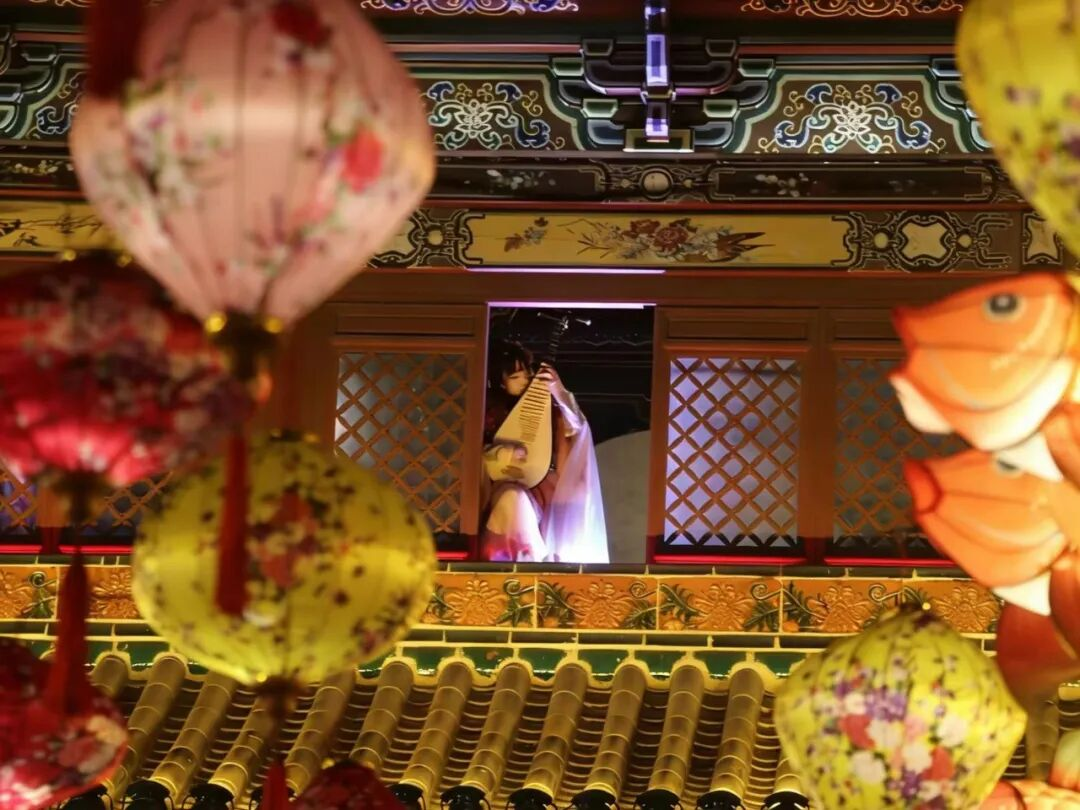 夜幕降临,鼓楼在金色灯光的映照下气势恢宏,飞檐翘角间尽显古建神韵。楼体之上,琵琶、二胡等传统乐器演奏者身着古风服饰,指尖流转间,经典曲目接连奏响。婉转的旋律穿越千年时空,与鼓楼的沧桑底蕴完美交融,为古朴的街巷平添了浓郁的新春雅韵。